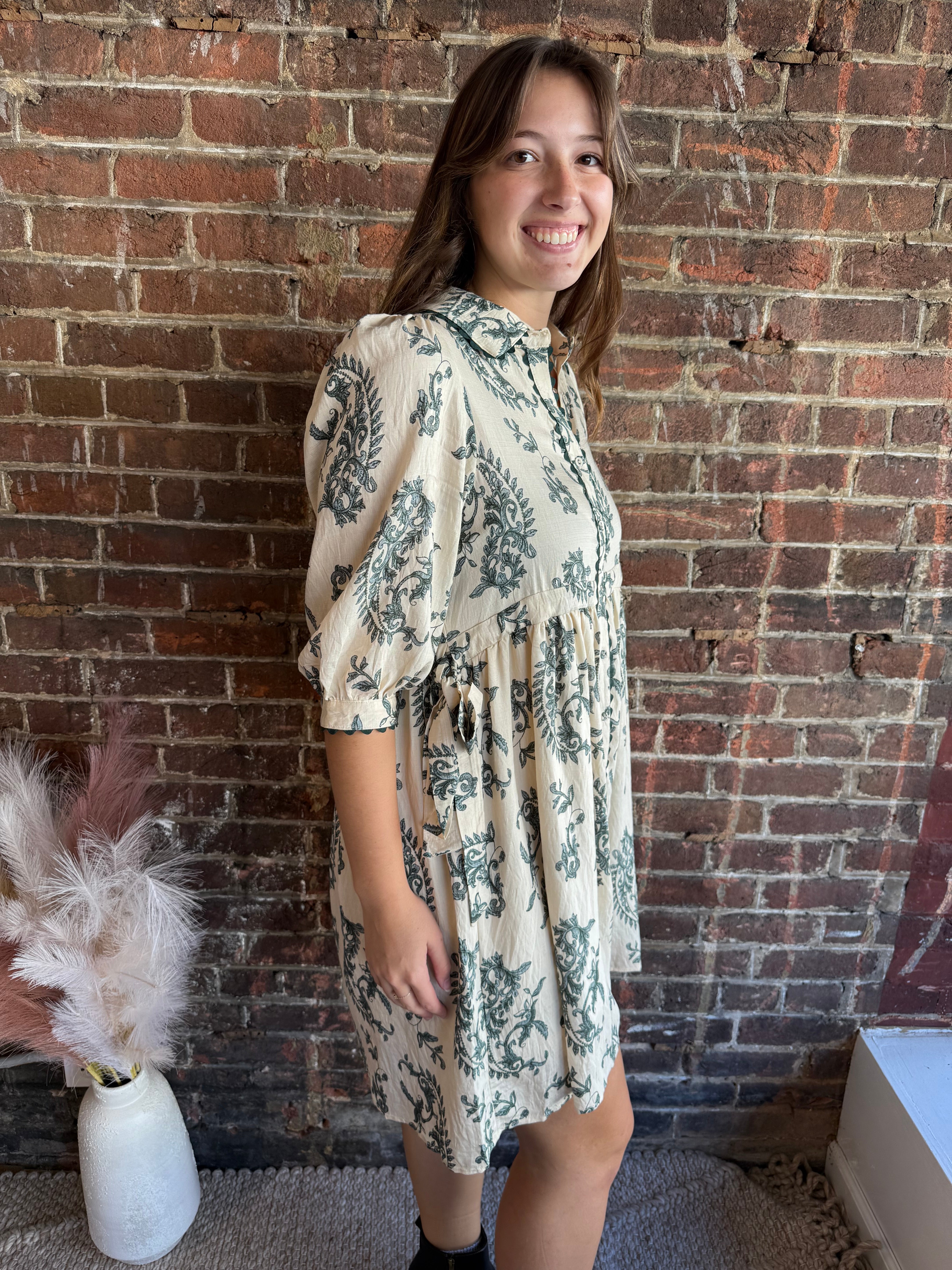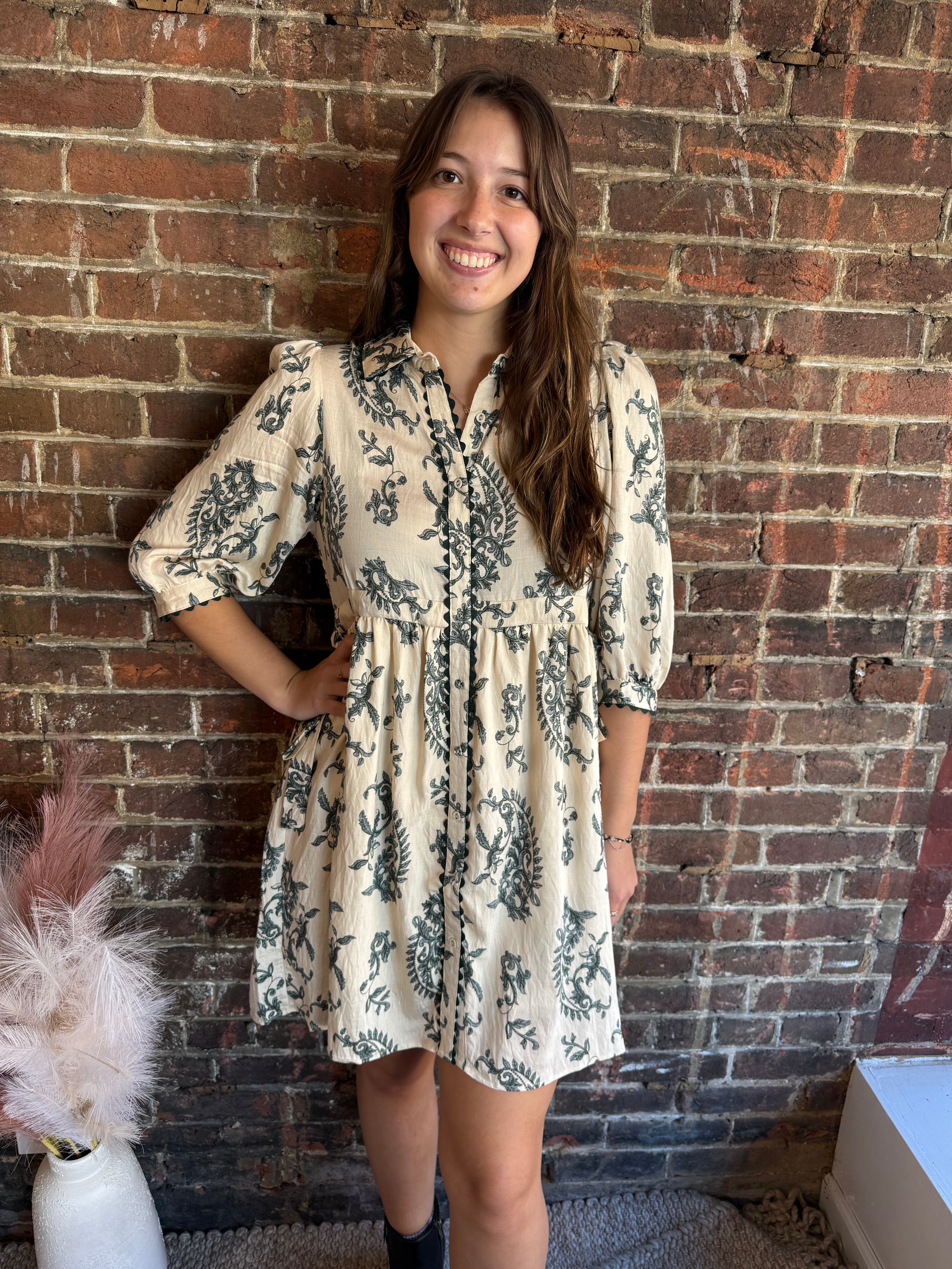 The Fallon Dress brings a playful twist to classic style with its button-down front, side ties for a customizable fit, and charming ric-rac trim. Its lined skirt ensures comfort and effortless movement, making it perfect for days when you want to feel flirty and fun.