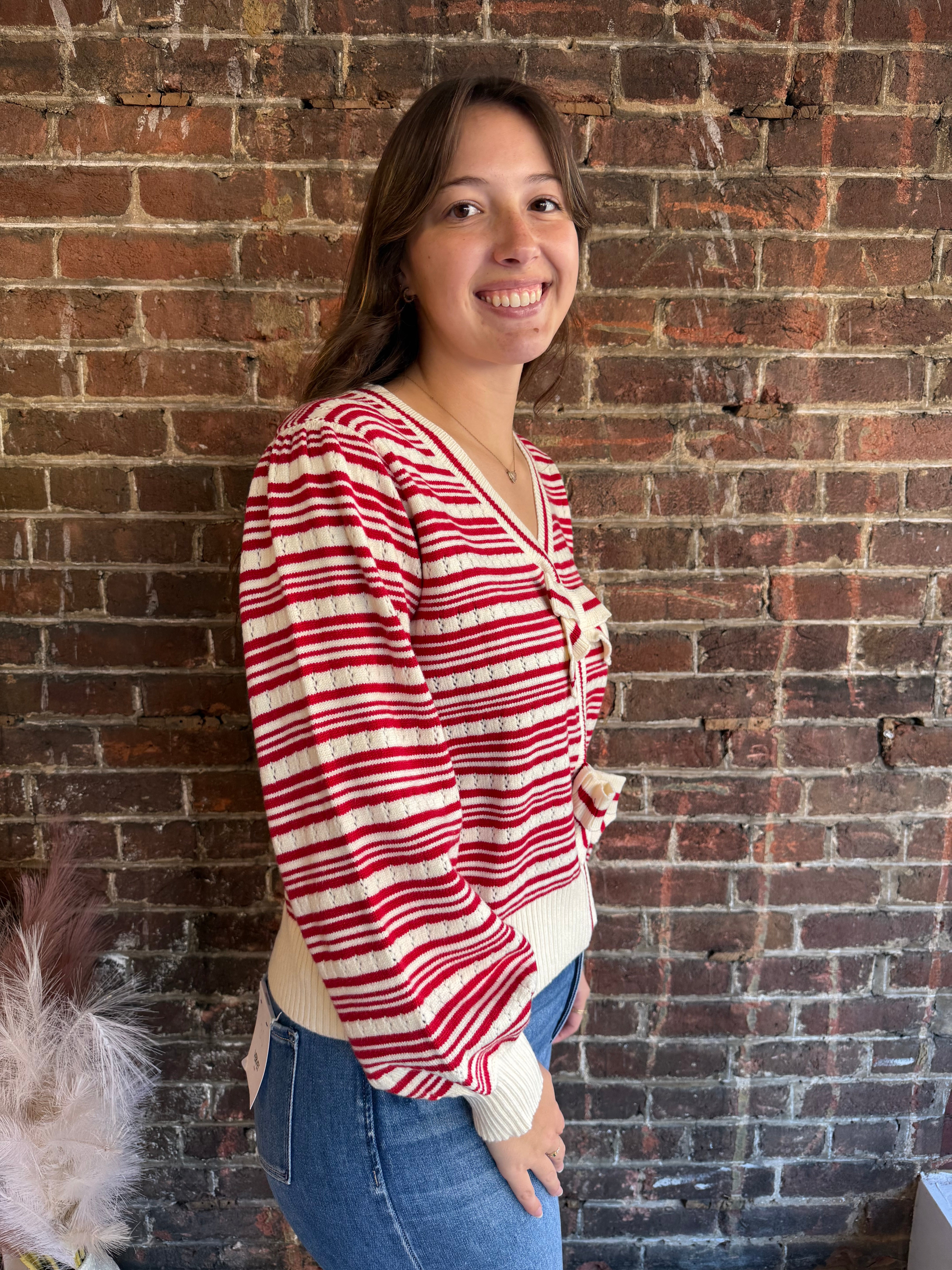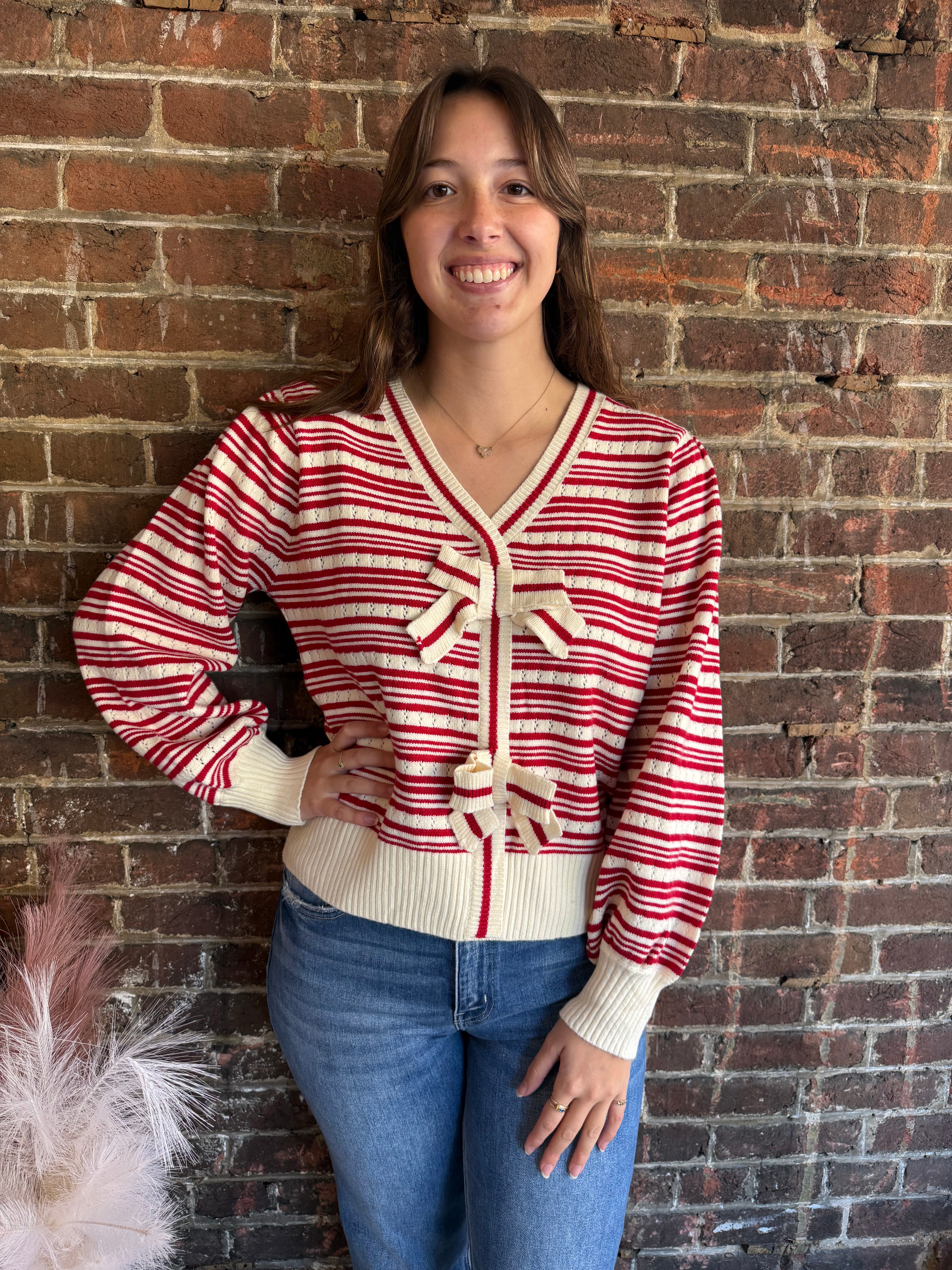 Add a touch of charm to your wardrobe with the Nicki Sweater. Featuring cheerful stripes and playful bows along the front, this V-neck sweater brings a fun and flirty vibe to any outfit. Perfect for cozying up or adding a whimsical twist to your everyday look.
