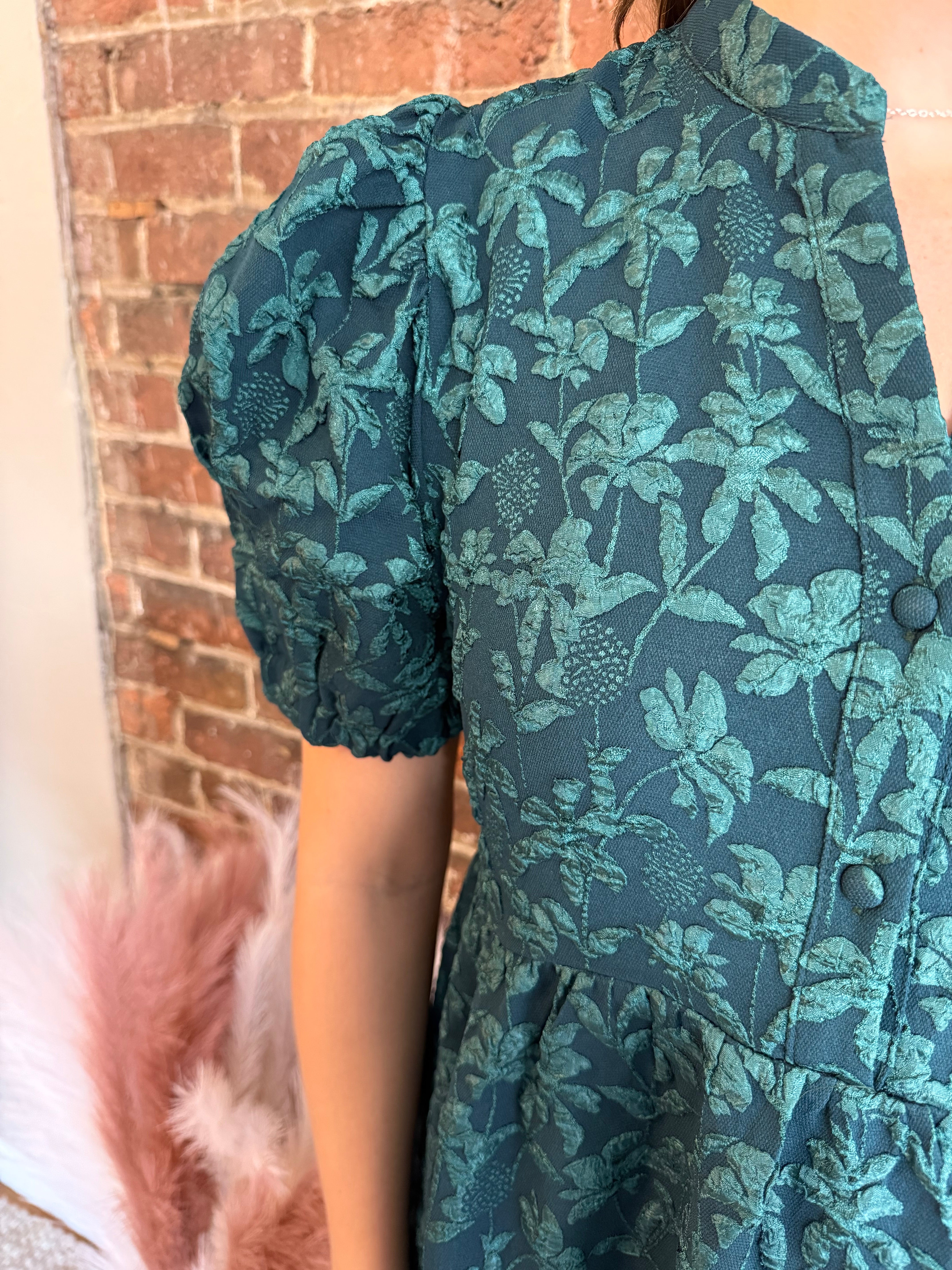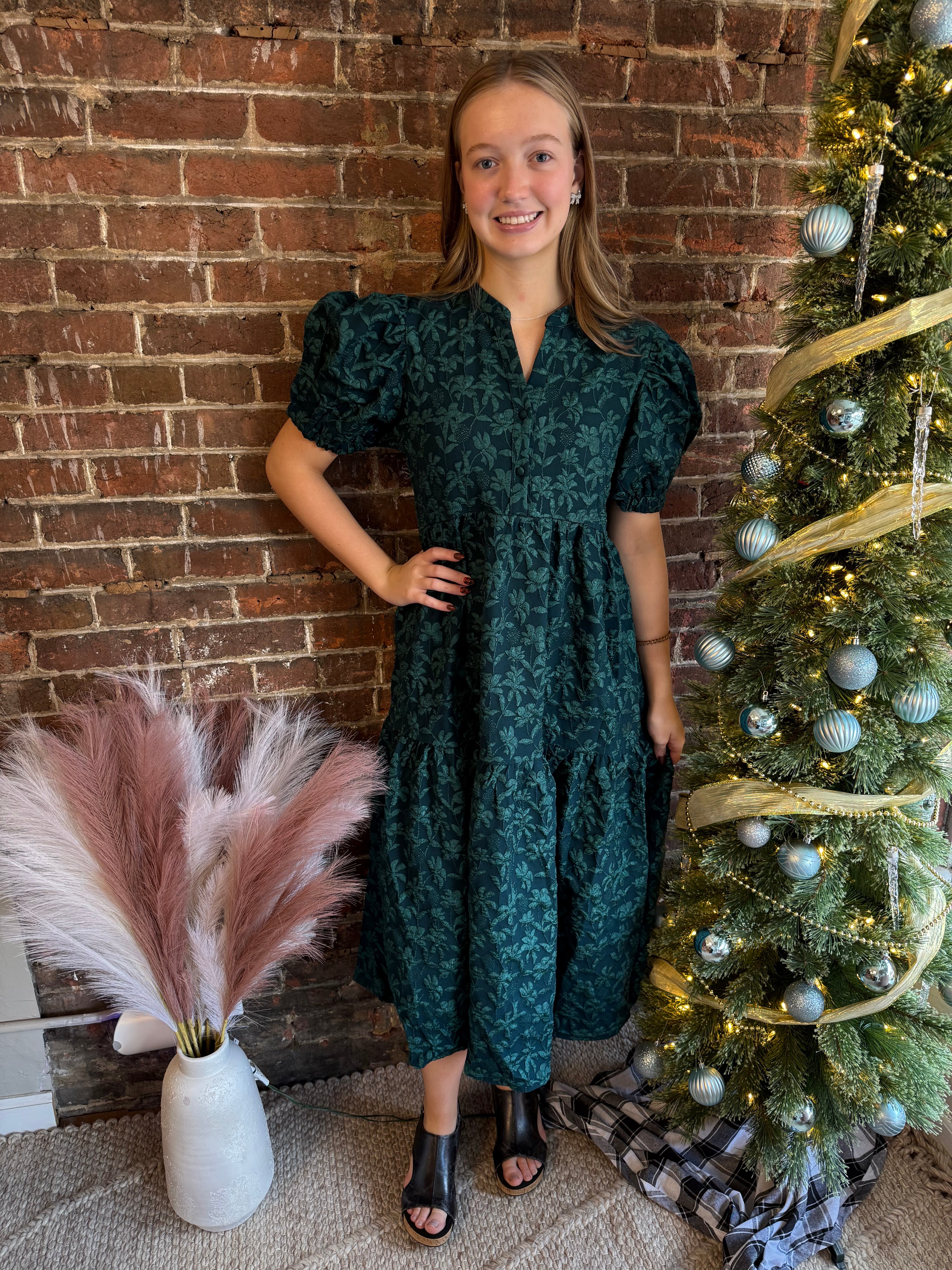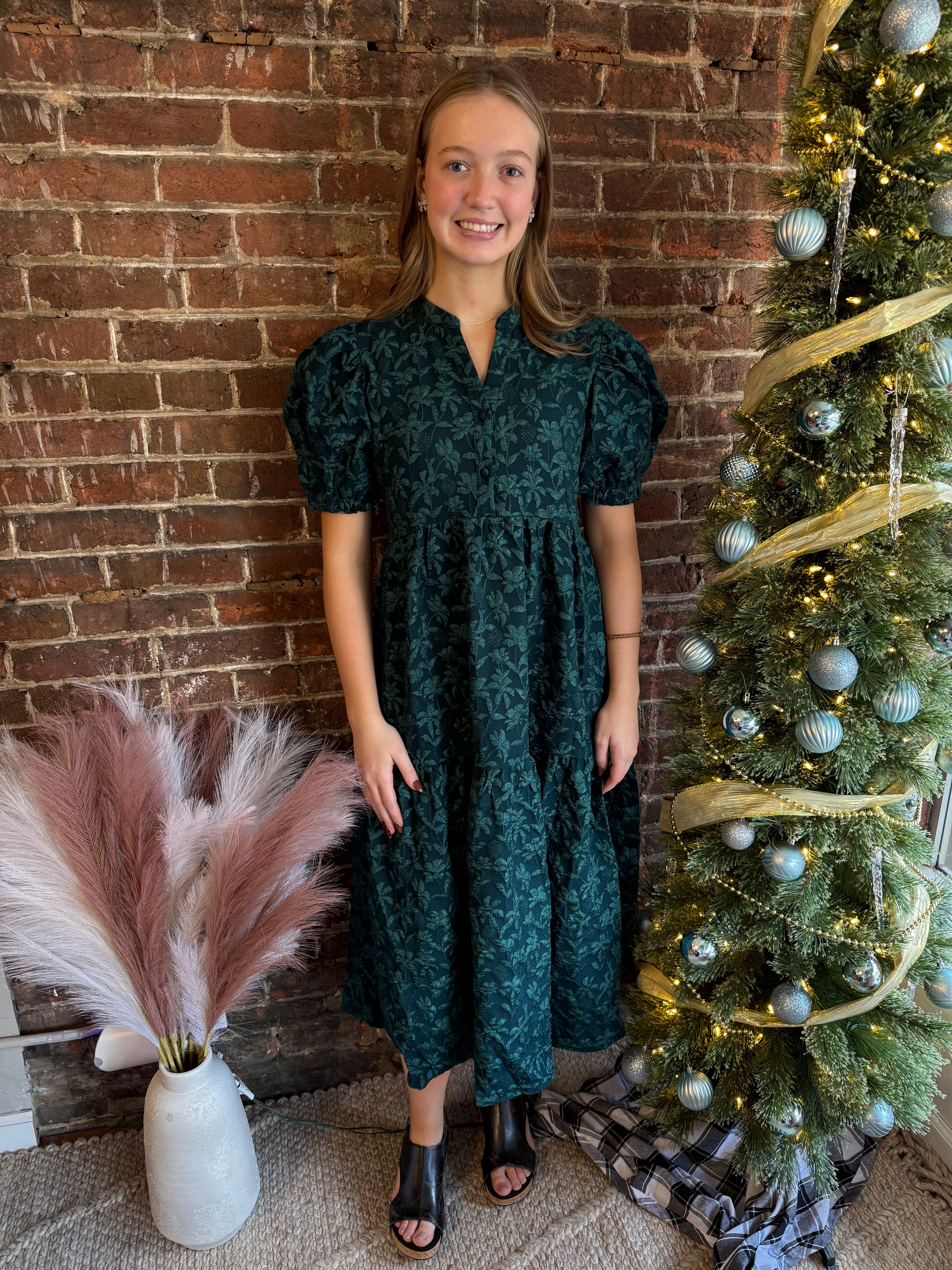 Elevate your wardrobe with the Flora Dress in a beautiful green hue accented by subtle glitter threads. Its elegant puff sleeves and flattering midi length create a timeless silhouette perfect for any occasion. This dress combines classic charm with a touch of sparkle, ensuring you stand out effortlessly from day to night.