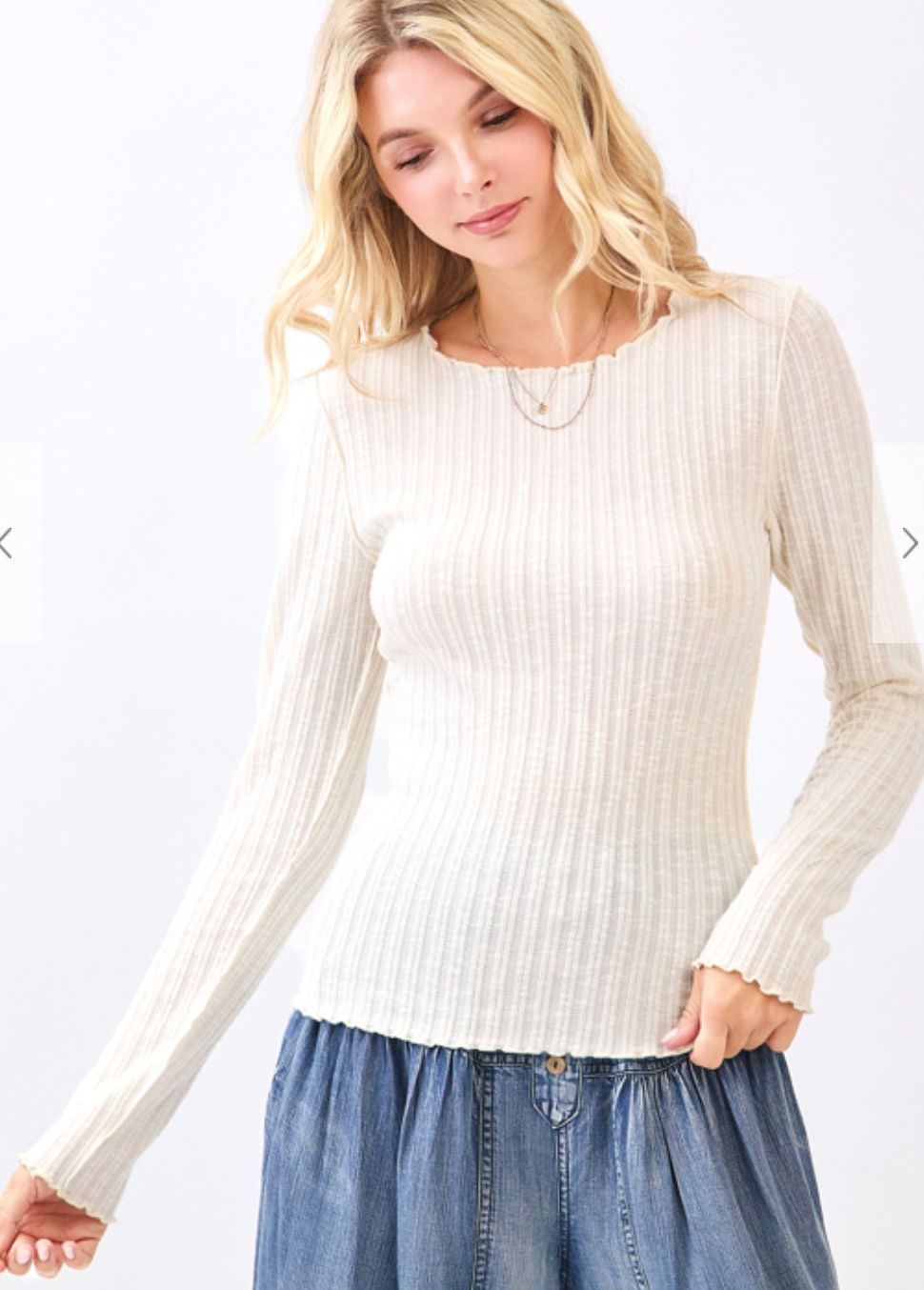 Elevate your wardrobe with the Maisie Top in Cream, crafted from soft ribbed sweater knit fabric that offers both comfort and style. Featuring a flattering round neck and long sleeves, this top delivers a timeless fitted look that suits any occasion. The delicate lettuce edge hem adds a subtle feminine touch, making it easy to pair with your favorite jeans or skirts for effortless chic every day.