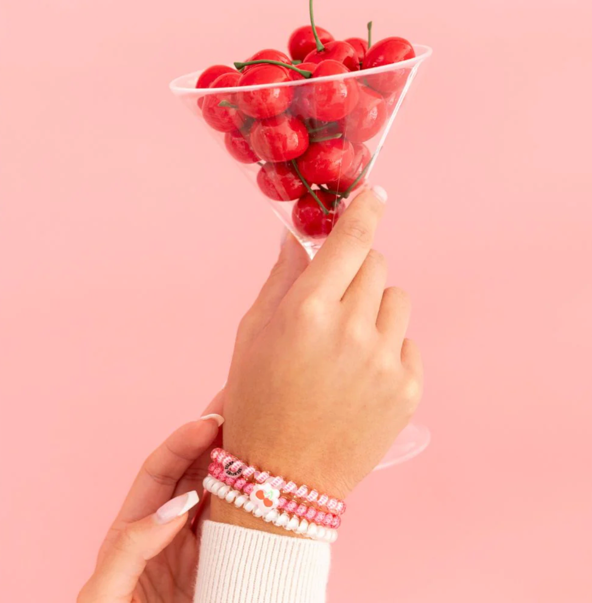 Cherry Bomb Small Hair Ties in Pink offer a strong grip without damage, doubling as a chic wrist accessory when not in use. Your new favorite hair essentials all year round.