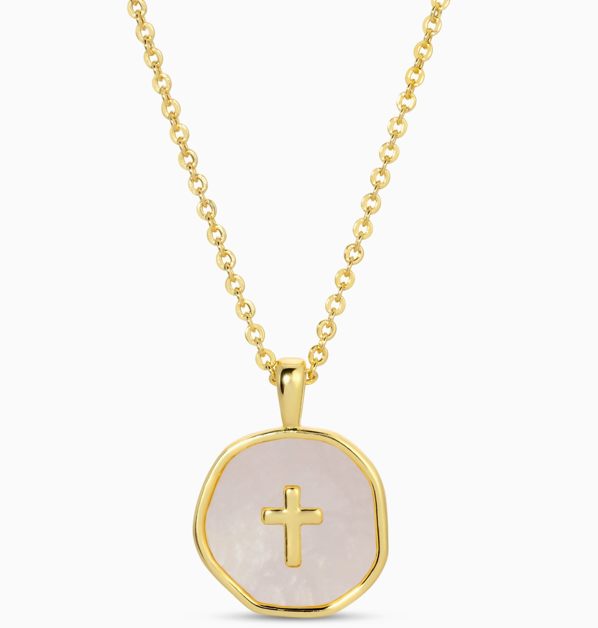 This stunning necklace boasts a 5" pendant with a .75" drop, featuring a unique shell inset (each one is one of a kind!) and a charming cross nestled within the shell. It's a lovely way to hold onto your beliefs!