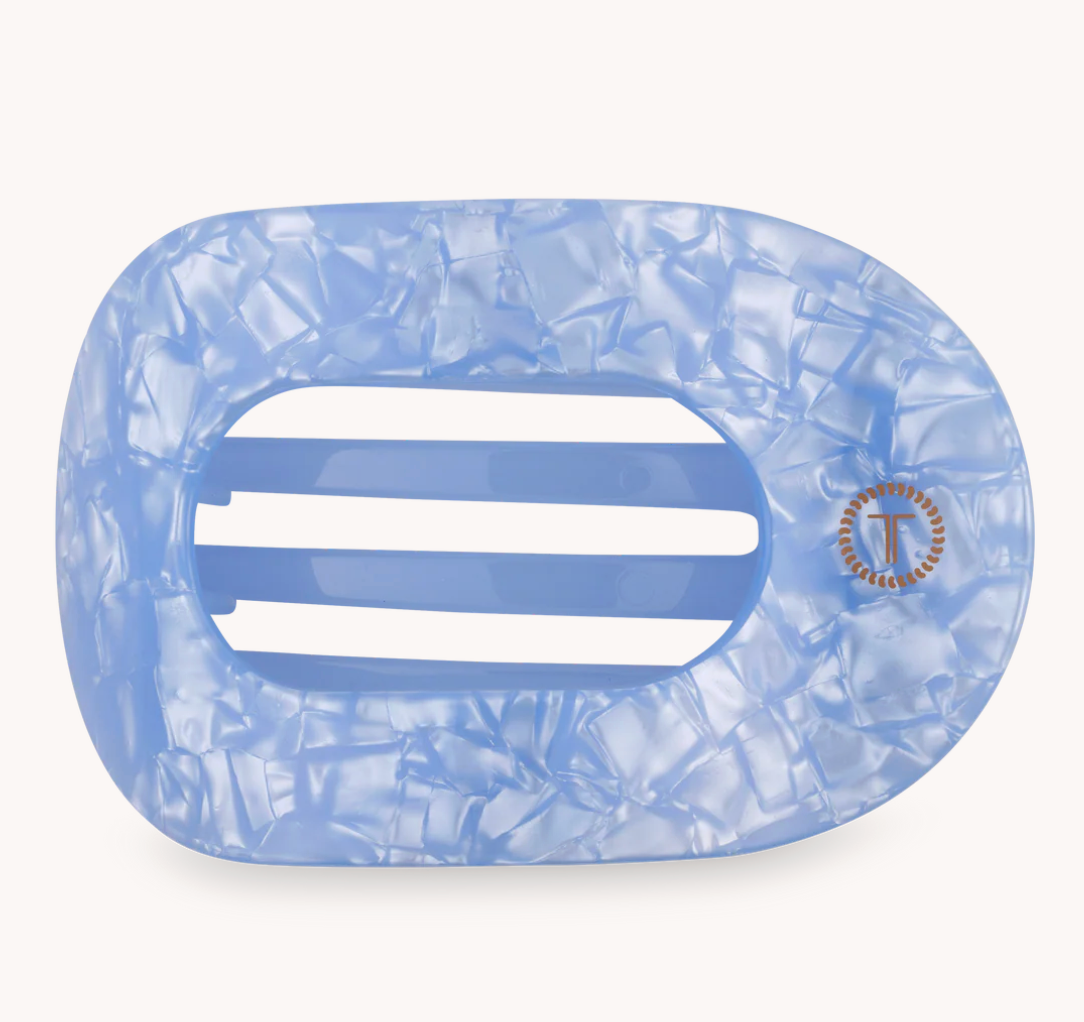 Lay flat and relax with the new TELETIES Blue Lagoon Large Flat Round Hair Clip in Blue. This hair clip is designed to allow you to lay back flat, do yoga, or sit comfortably in a seat with a headrest, and it is made with the same material that is nearly unbreakable.