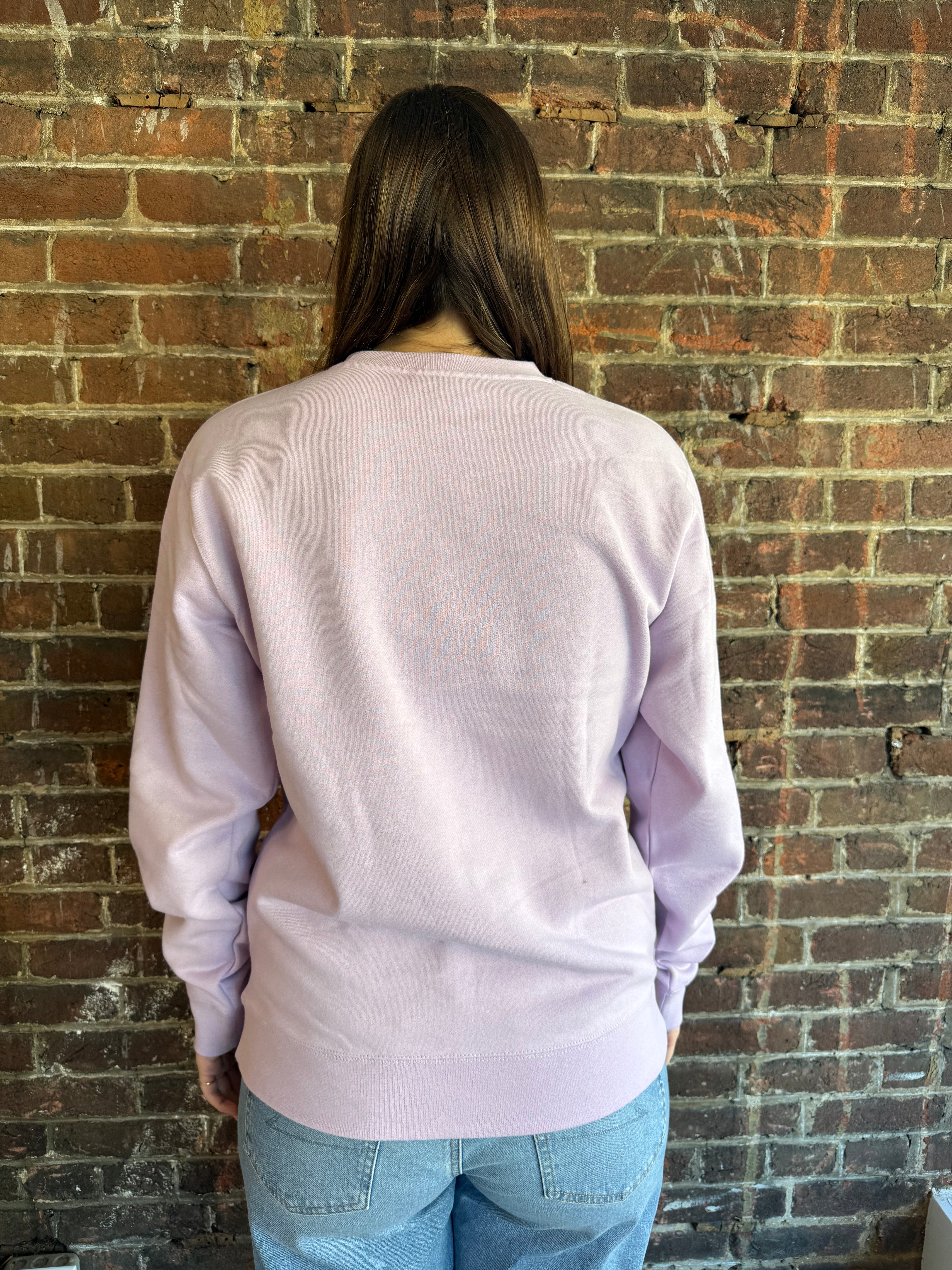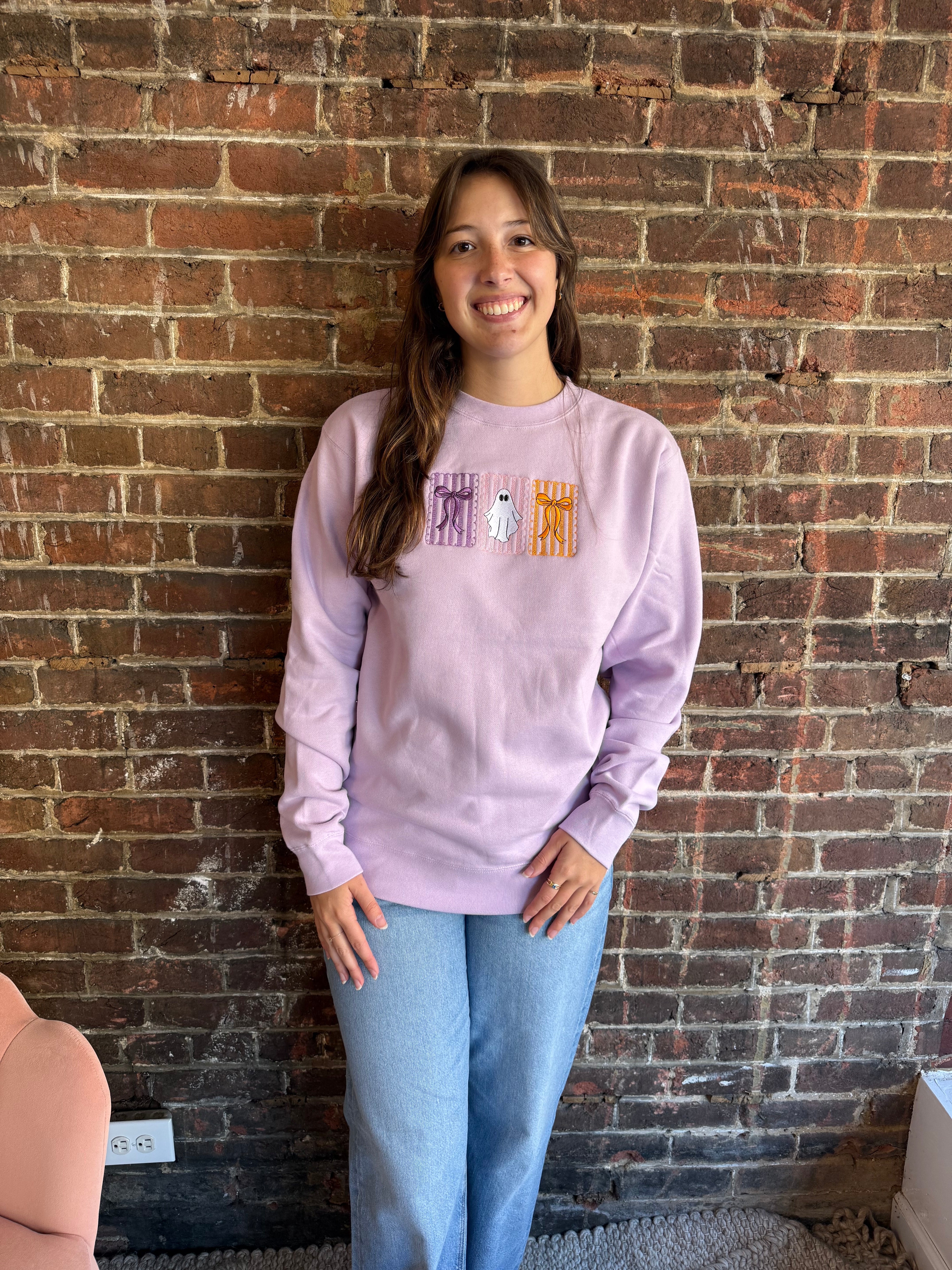 Embrace spooky charm with this light purple sweatshirt, featuring delicate embroidery of playful ghosts and cute bows. Perfect for Halloween, it adds a festive yet stylish touch to your wardrobe. Soft and comfortable, it keeps you cozy while showcasing your seasonal spirit with a unique, feminine flair.