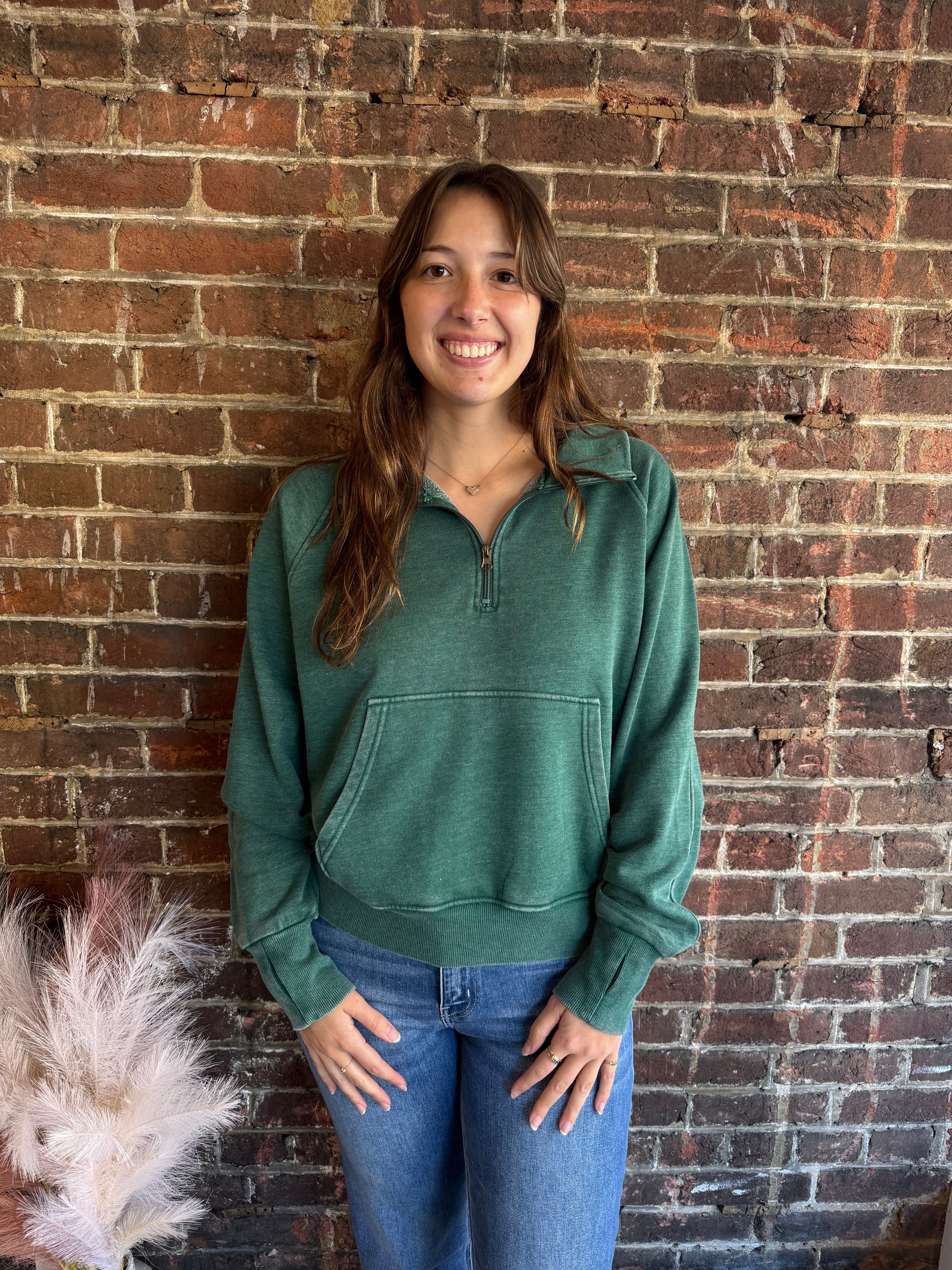 The Ryleigh Sweatshirt adds a playful vibe to your wardrobe with its cropped funnel neck and convenient quarter zipper closure. Its long sleeves feature thumbholes to keep your hands cozy and add a fun flair. The front kangaroo pocket is perfect for stashing small essentials or warming up your hands, while the slightly cropped hemline gives it a trendy, fresh finish that pairs perfectly with your favorite high-waisted pieces.