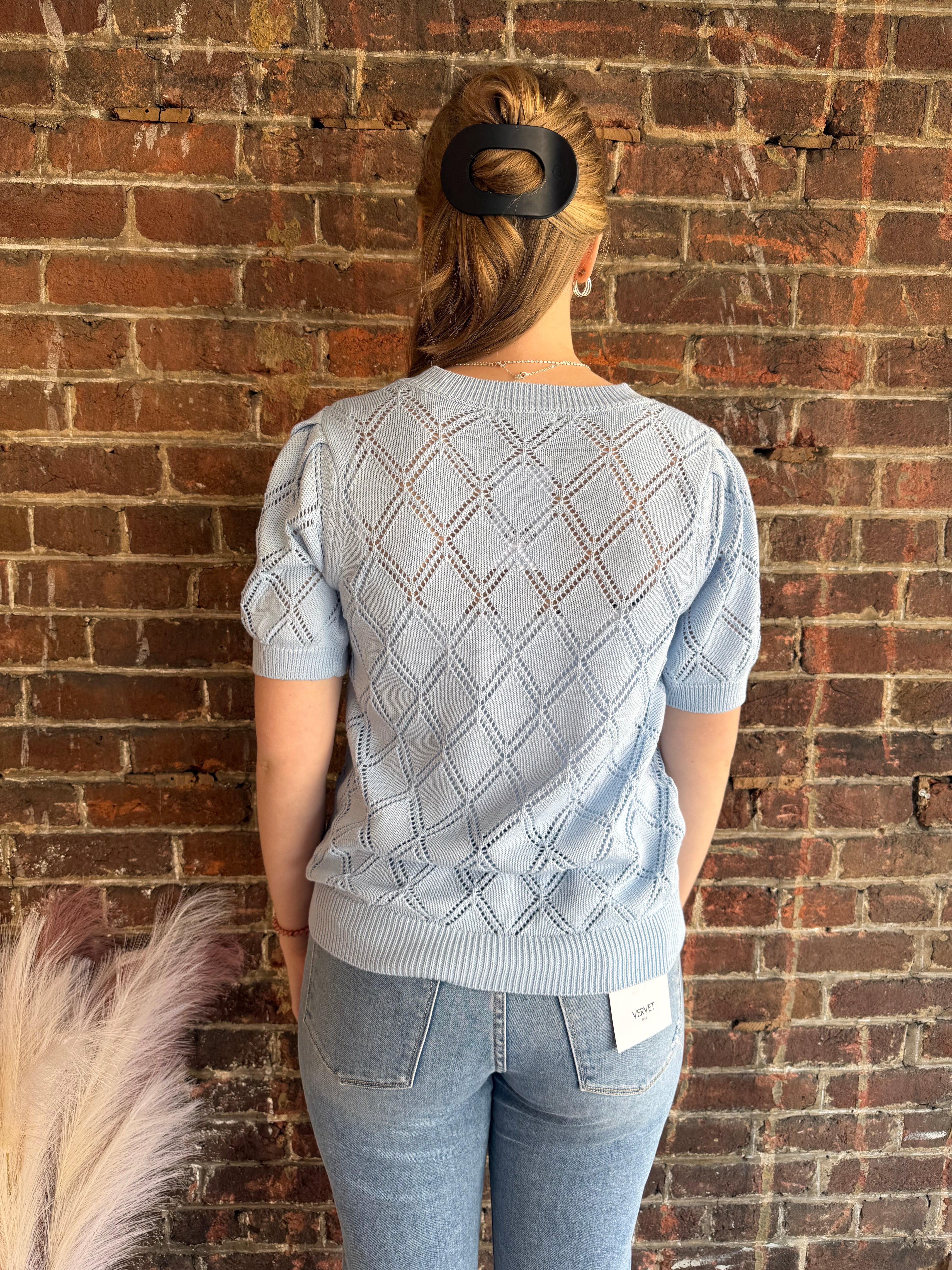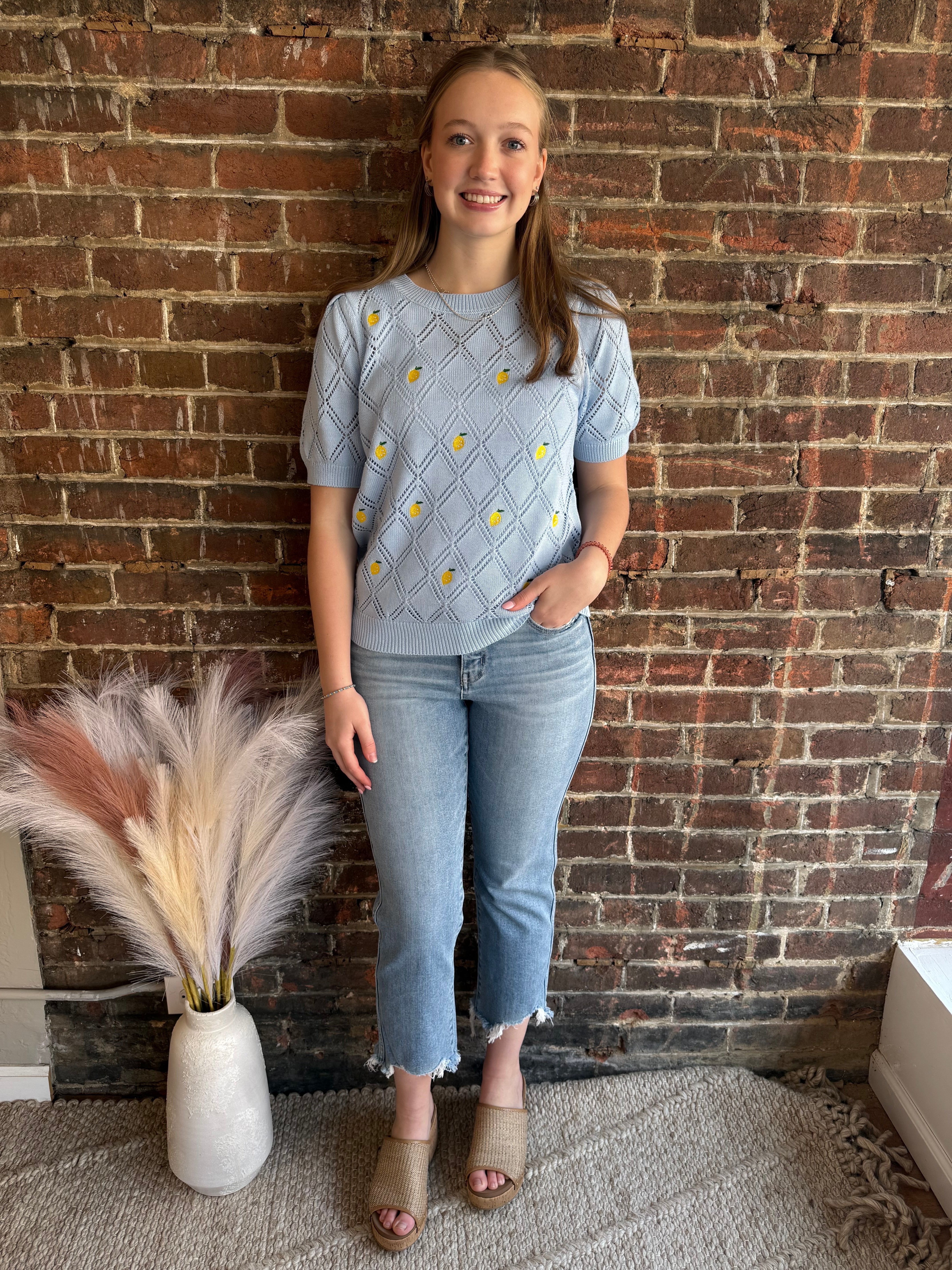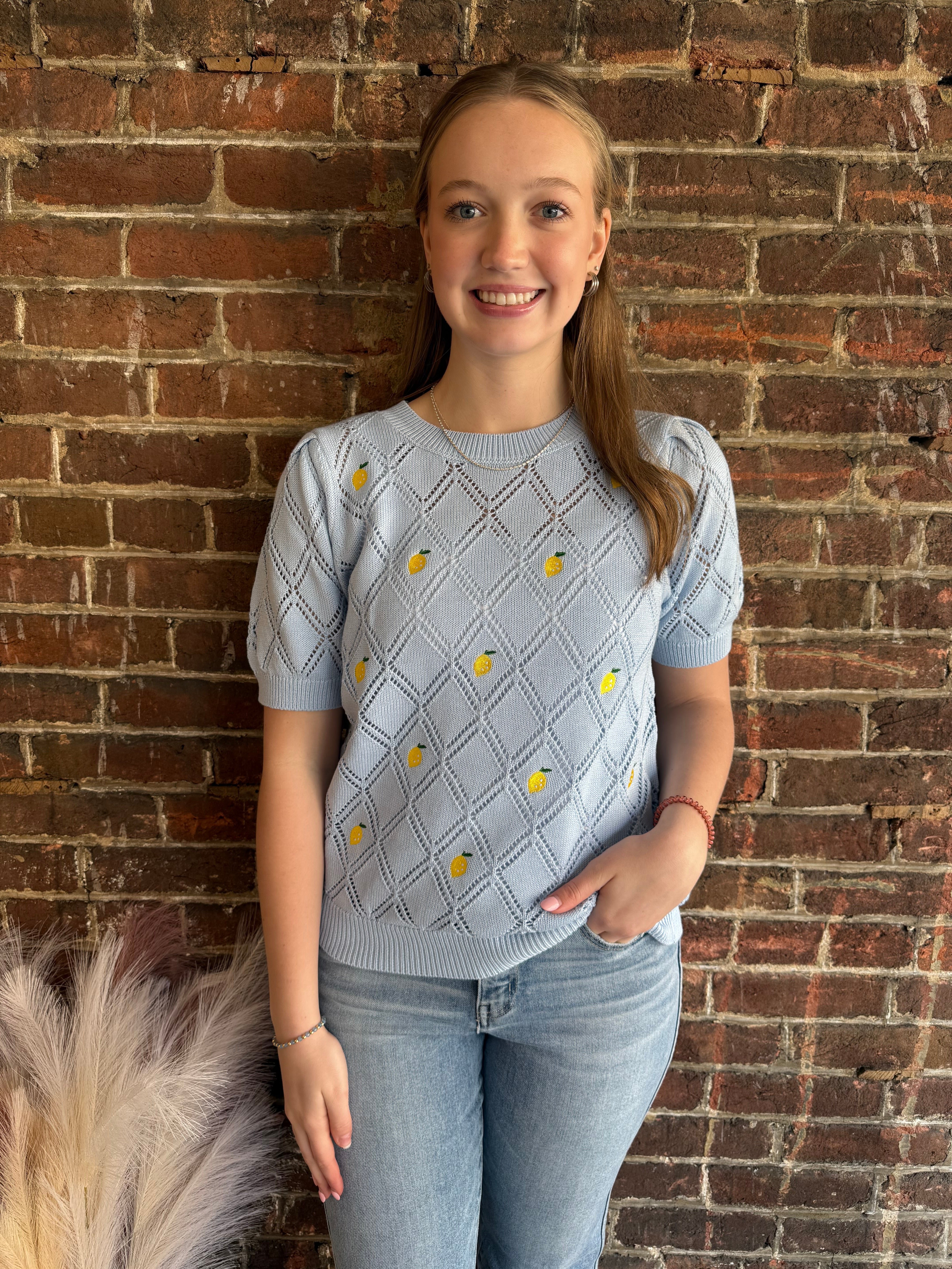 Elevate your everyday wardrobe with the Remi Top, a charming chambray sweater featuring delicate lemon embroidery that adds a playful touch. The short balloon sleeves create a flattering silhouette, while the pointelle knit provides breathable texture and subtle visual interest. Perfect for layering or wearing solo, this versatile piece transitions seamlessly from season to season. A timeless staple with modern details.