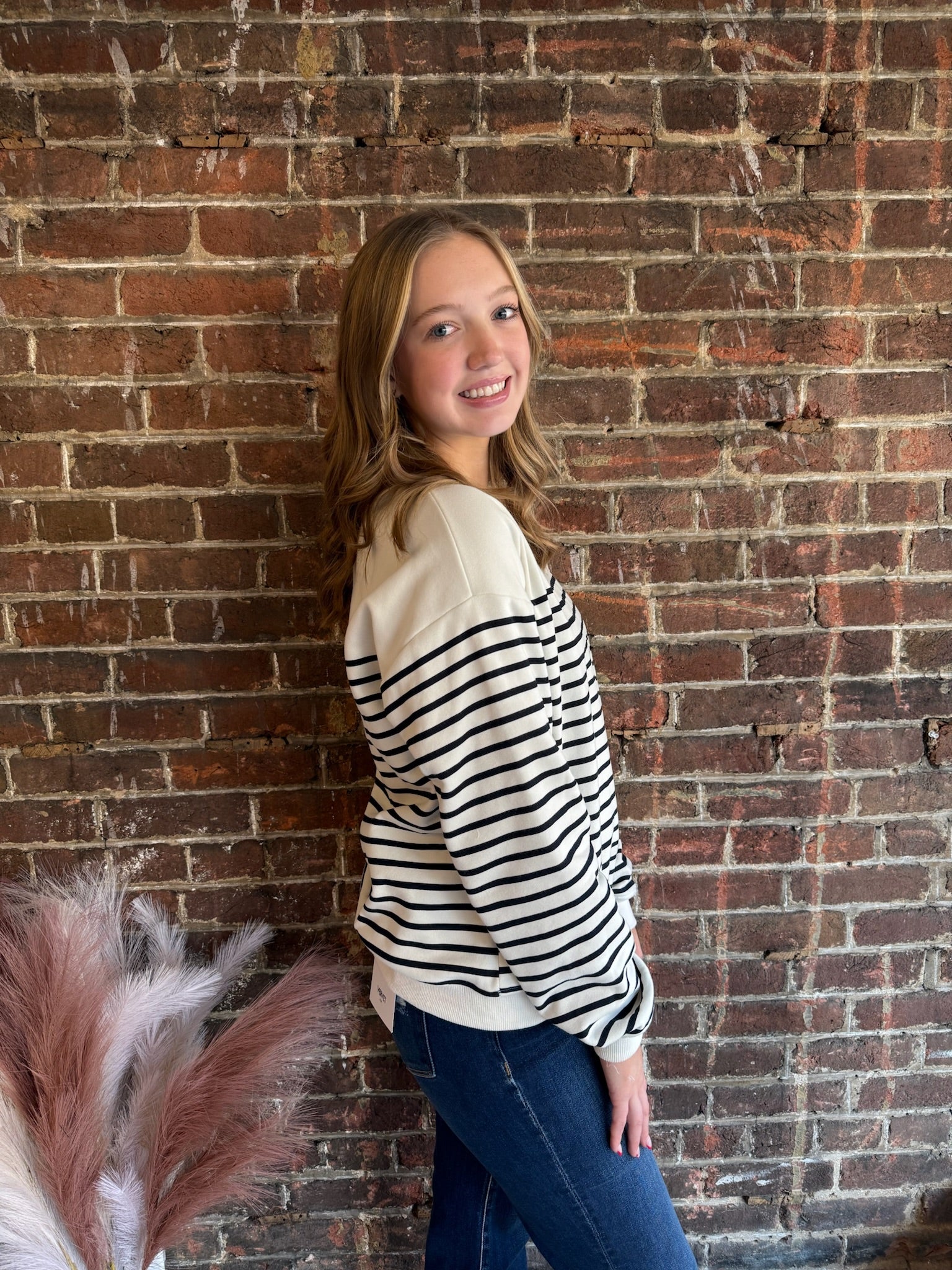 Cozy meets cute in the Leah Pullover Top! Made from soft brushed French terry, this crew neck sweater features playful black stripes and a charming embroidered heart on the chest—perfect for adding a little love to your casual look.