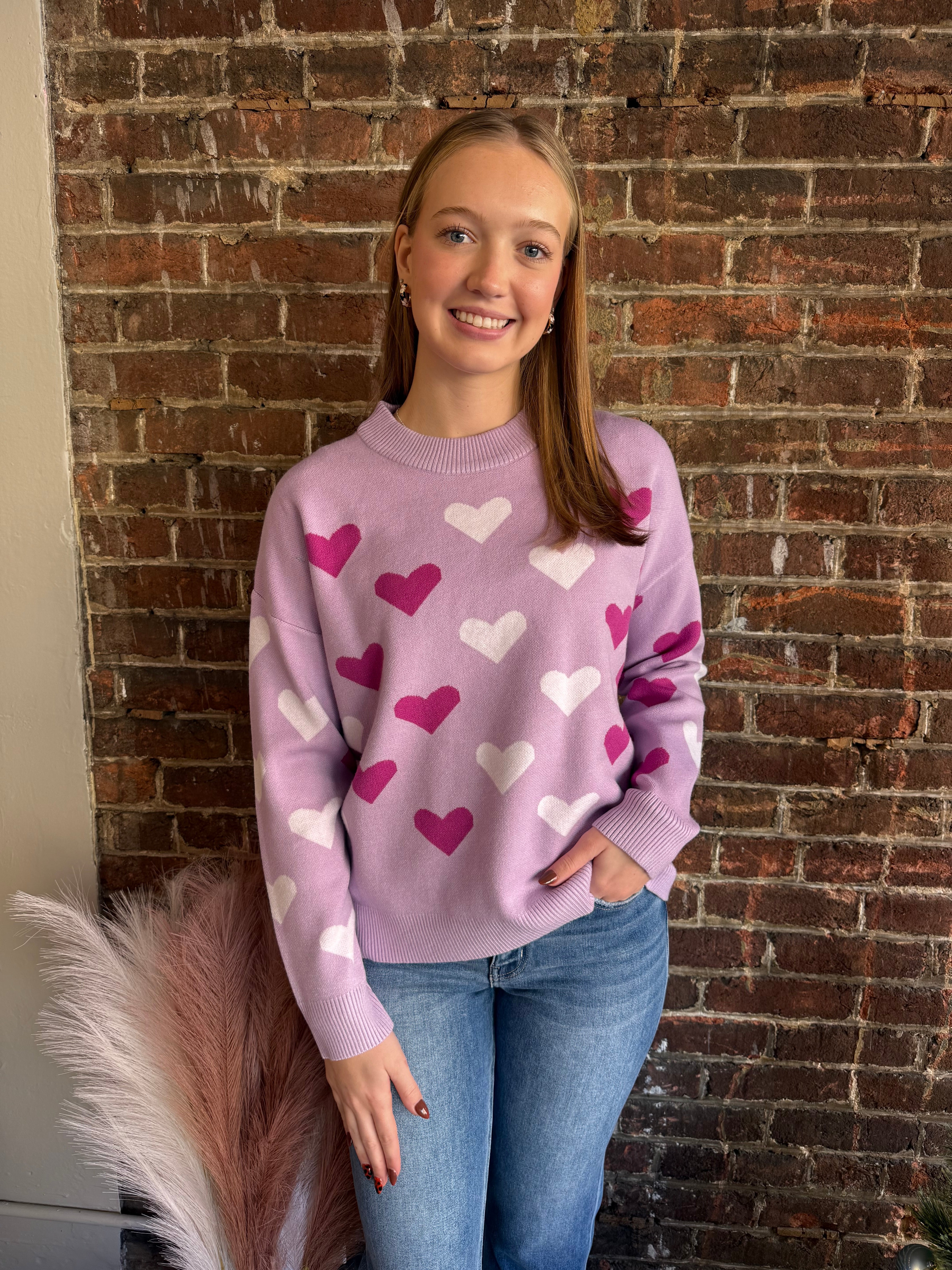 Wrap yourself in charm with the Lillian Sweater, featuring a playful heart jacquard pattern in a dreamy lavender hue. Its cozy crew neck pullover design keeps things casual yet cute, perfect for brightening up any chilly day. Soft and stylish, this sweater adds a touch of sweetness to your everyday wardrobe.