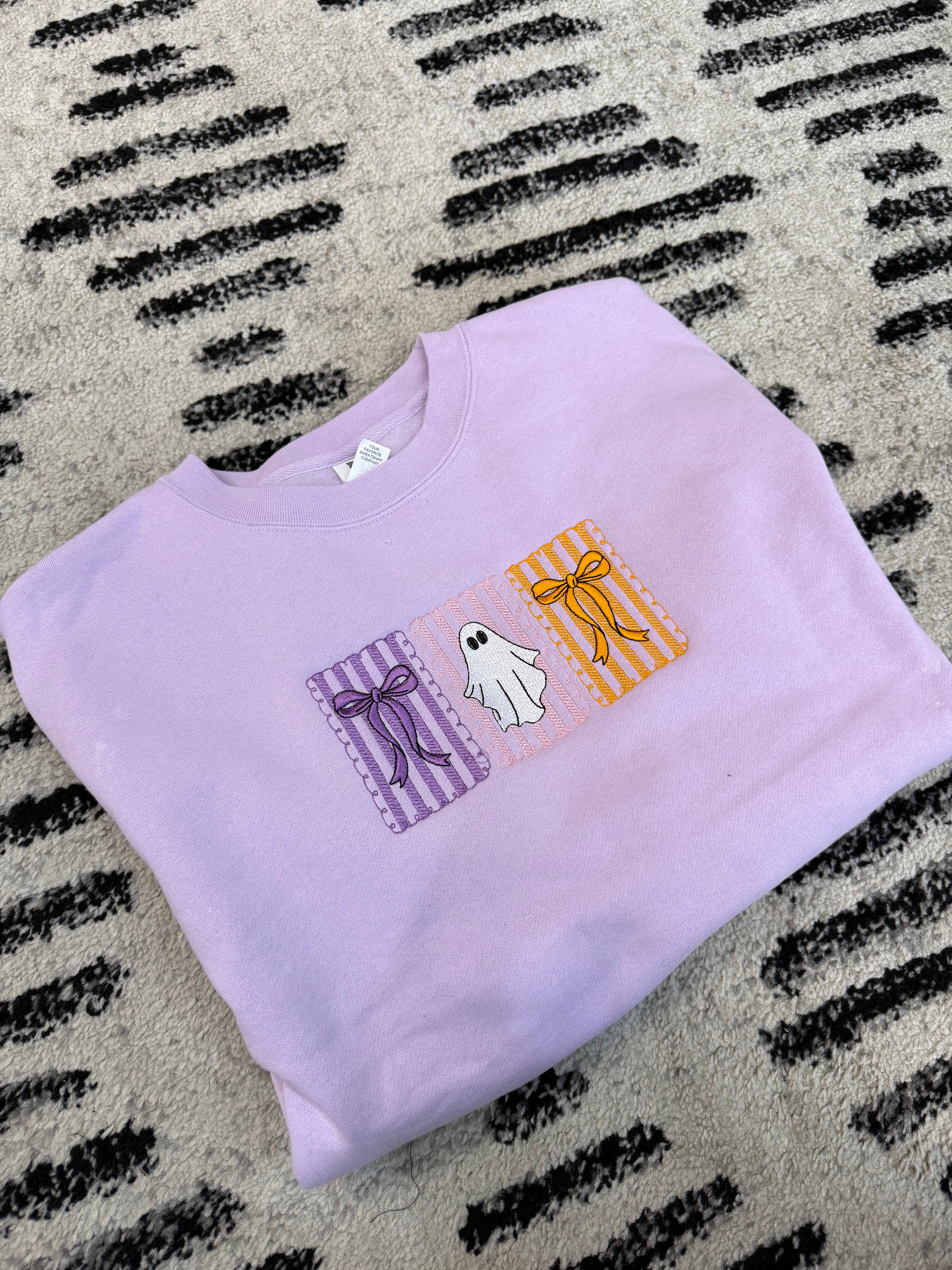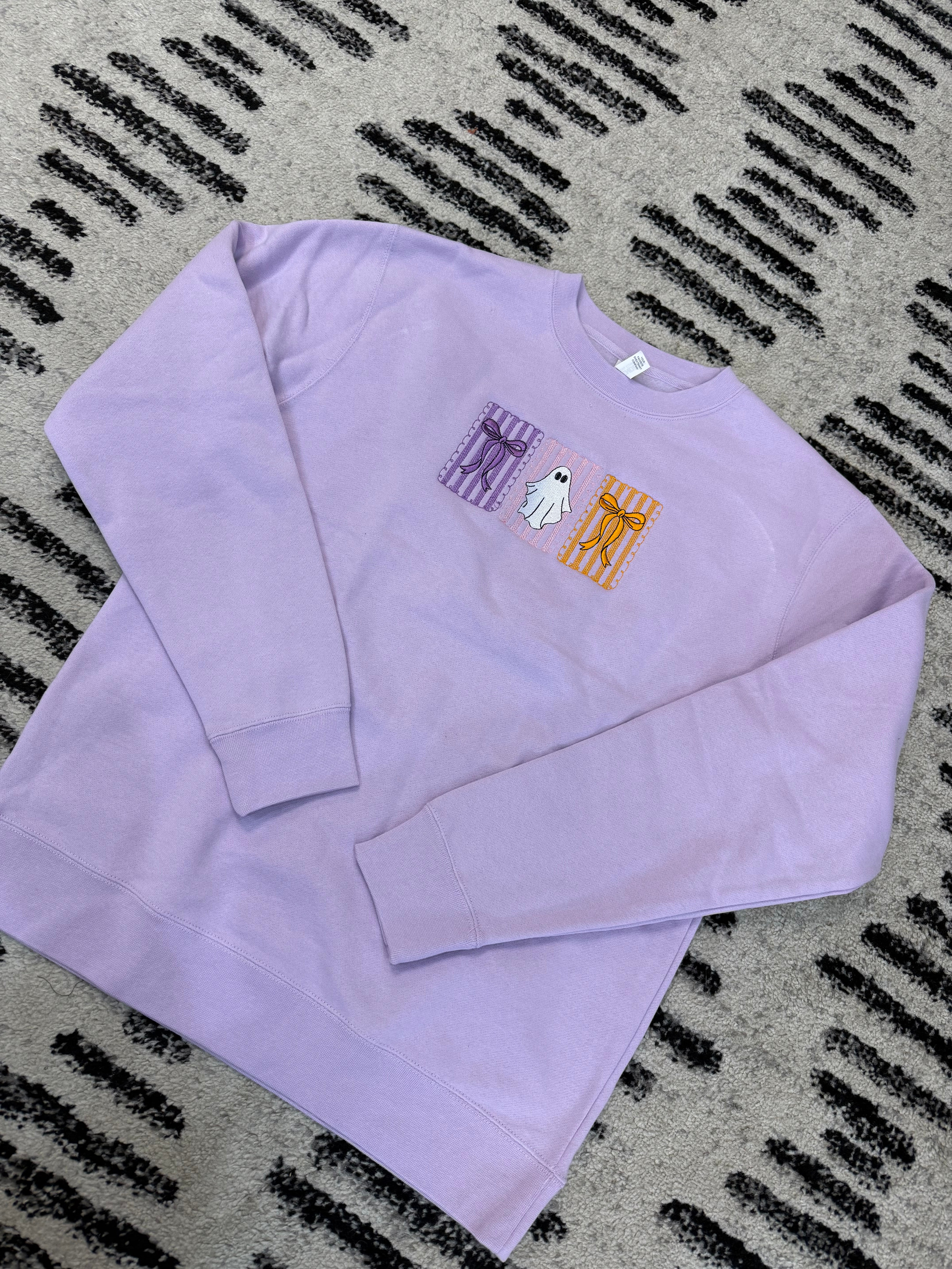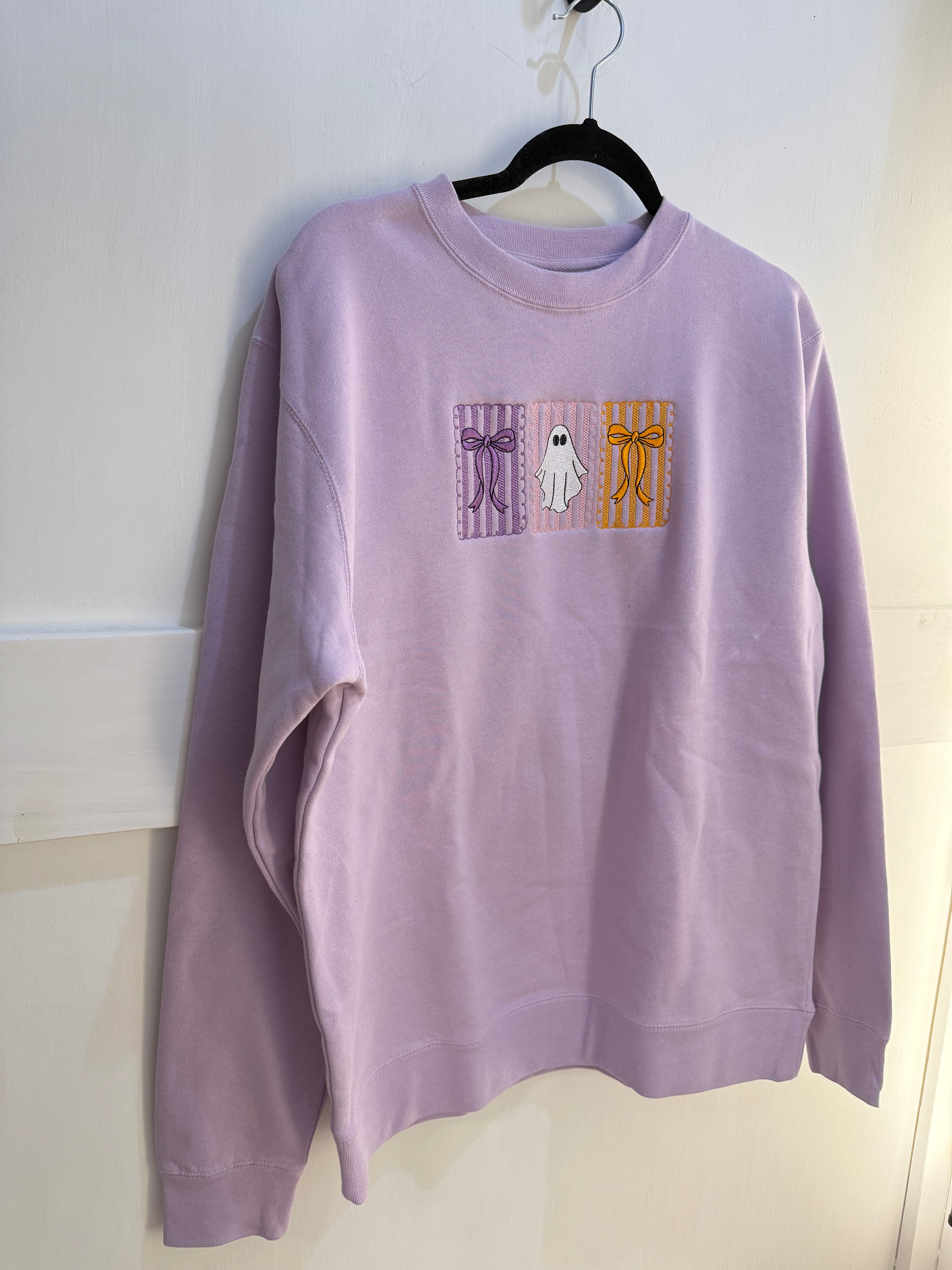 Embrace spooky charm with this light purple sweatshirt, featuring delicate embroidery of playful ghosts and cute bows. Perfect for Halloween, it adds a festive yet stylish touch to your wardrobe. Soft and comfortable, it keeps you cozy while showcasing your seasonal spirit with a unique, feminine flair.