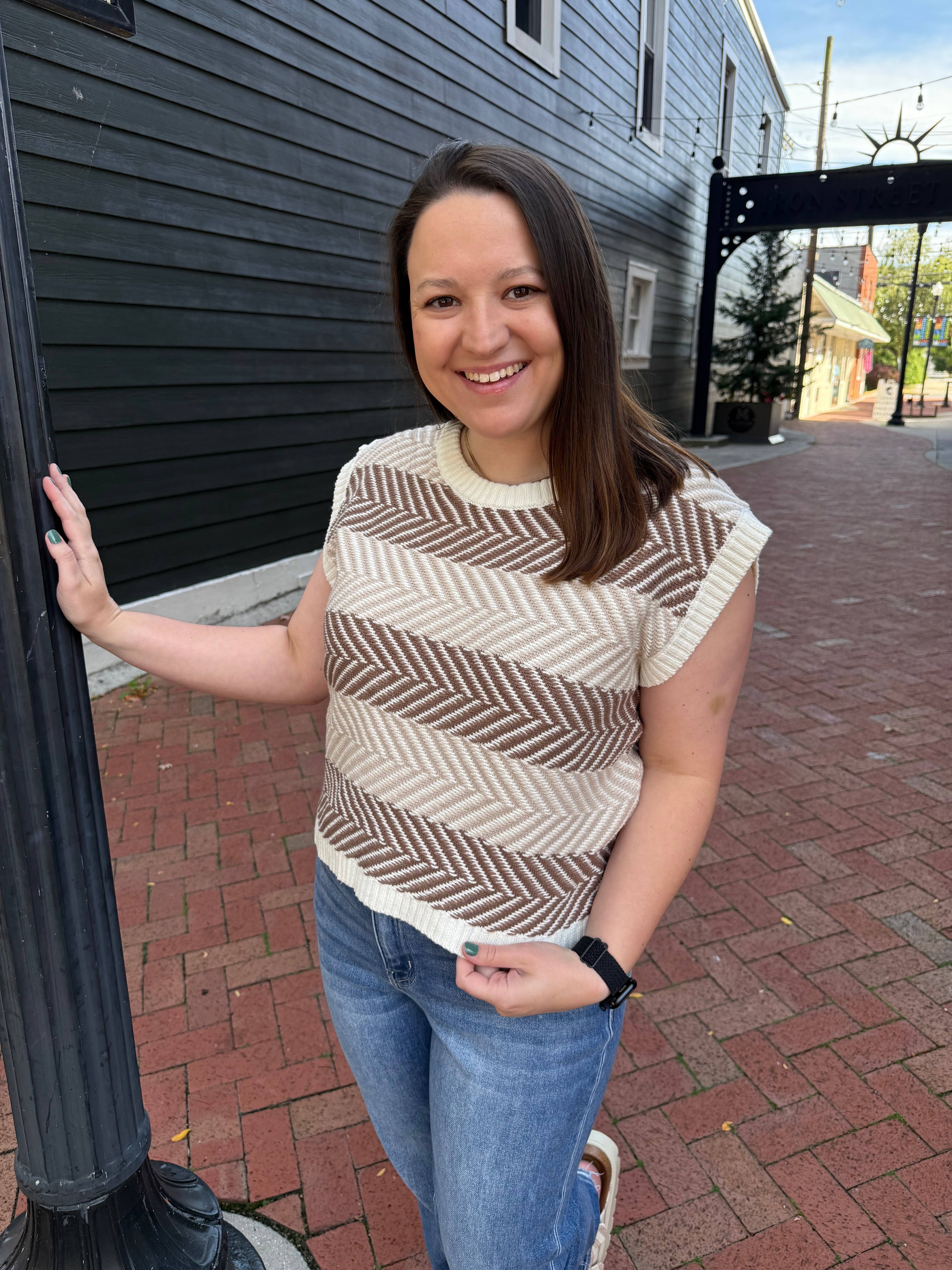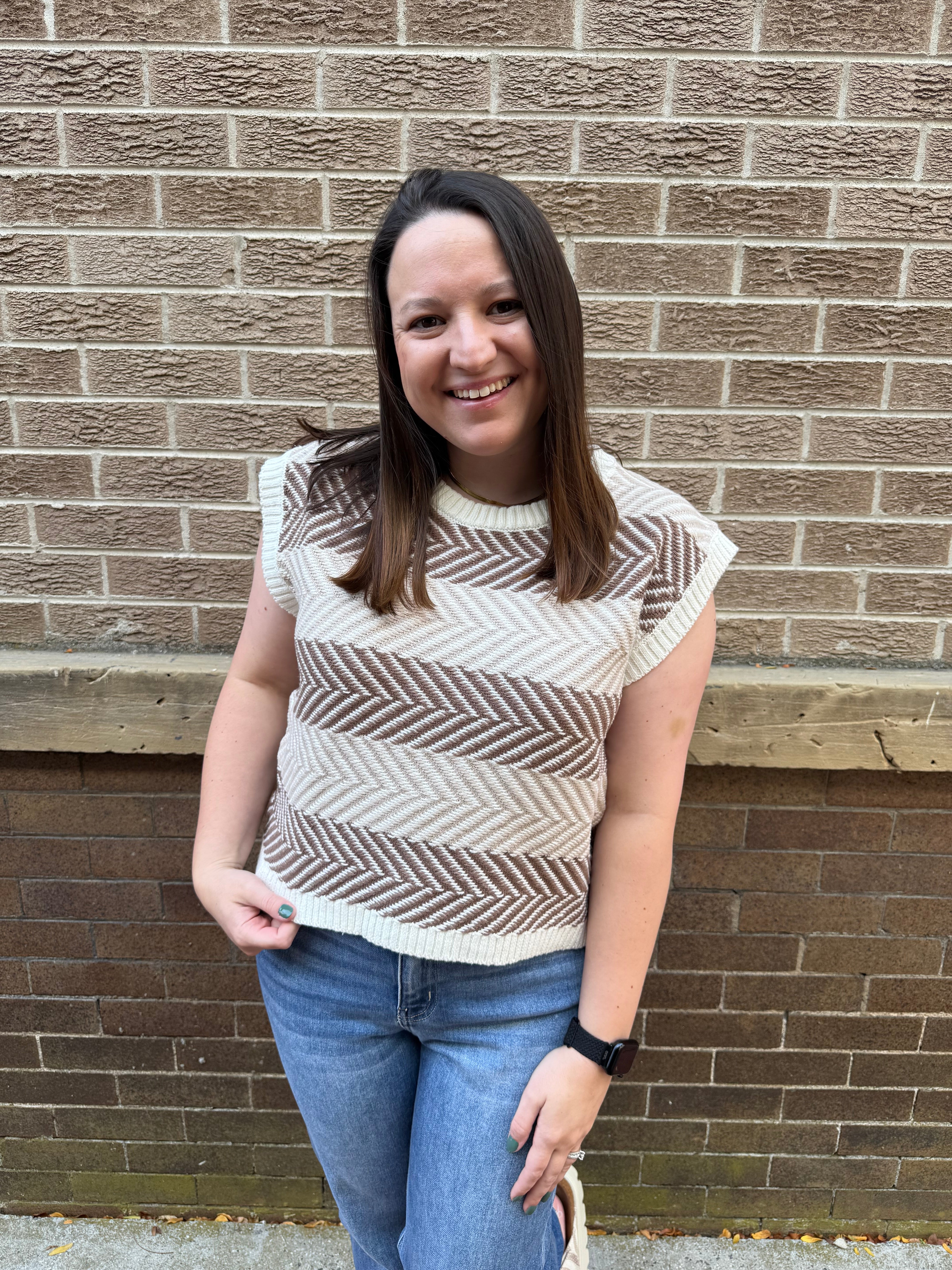 Elevate your wardrobe with the Marie Sweater Top, designed to combine modern flair with timeless style. Its bold horizontal chevron stripes and textured knit make a confident statement, while the crew neckline and subtle cap sleeves ensure a flattering, comfortable fit. Finished with a clean ribbed hem, this top is your go-to for effortless sophistication every day.