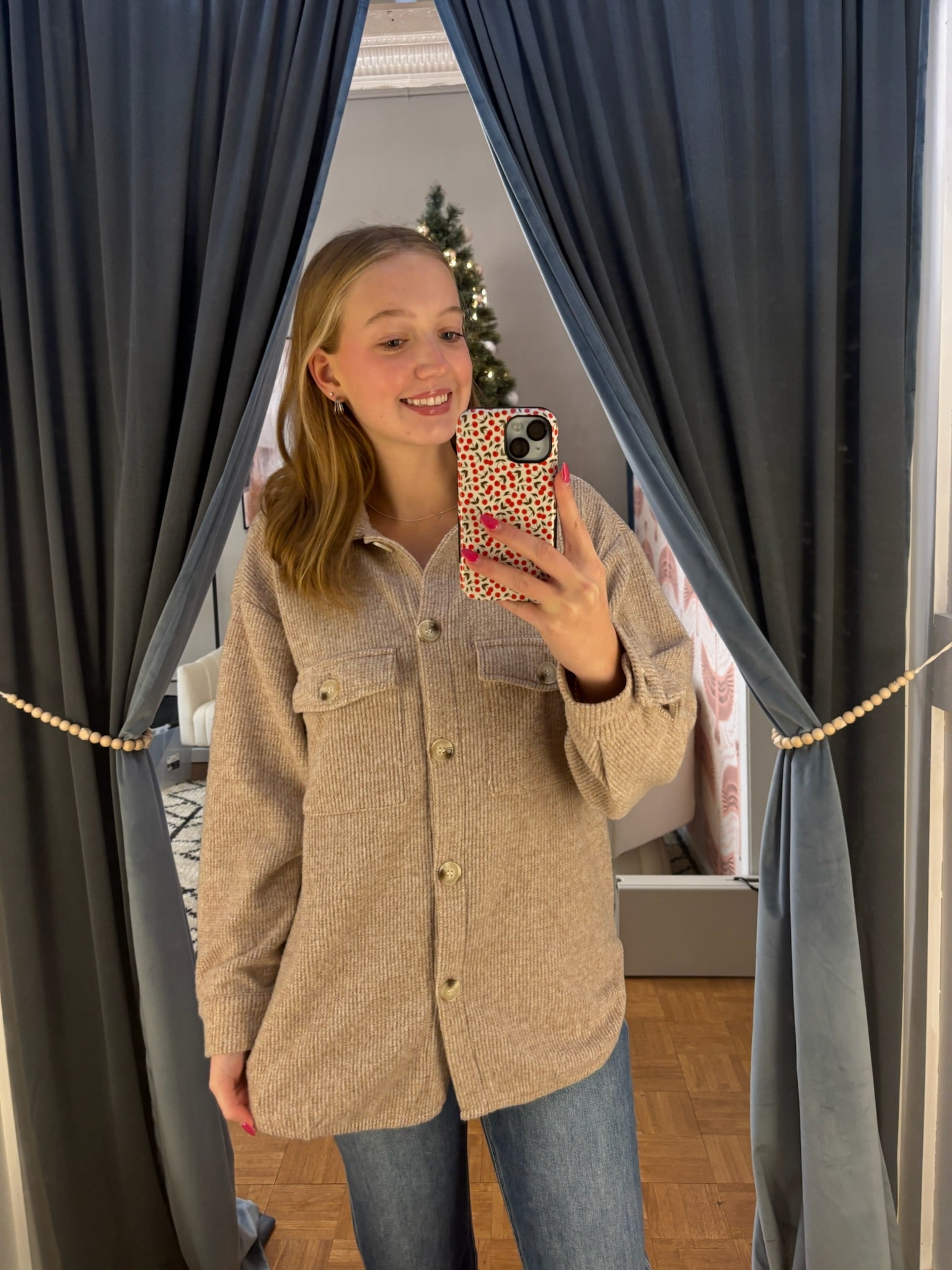 Stay snug and stylish with this oversized button-up made from soft, brushed thermal fabric. Its relaxed fit and classic chest pockets give you just the right mix of cozy and cool for chilly days. Whether you’re chasing pumpkin patches or latte dates, this go-to layer adds effortless charm. Toss it on with your favorite jeans and ankle boots, and you’re all set for fall fun!
