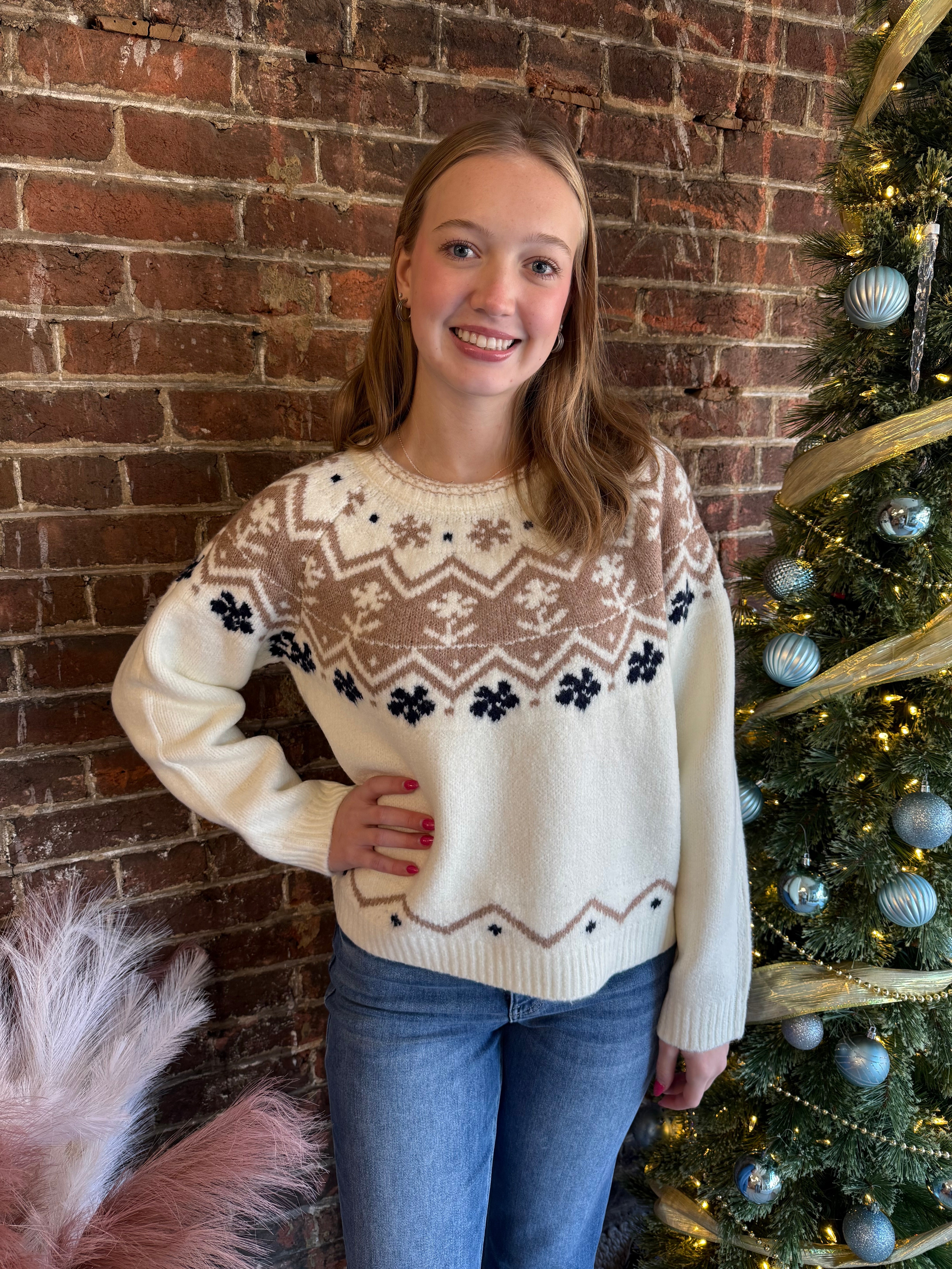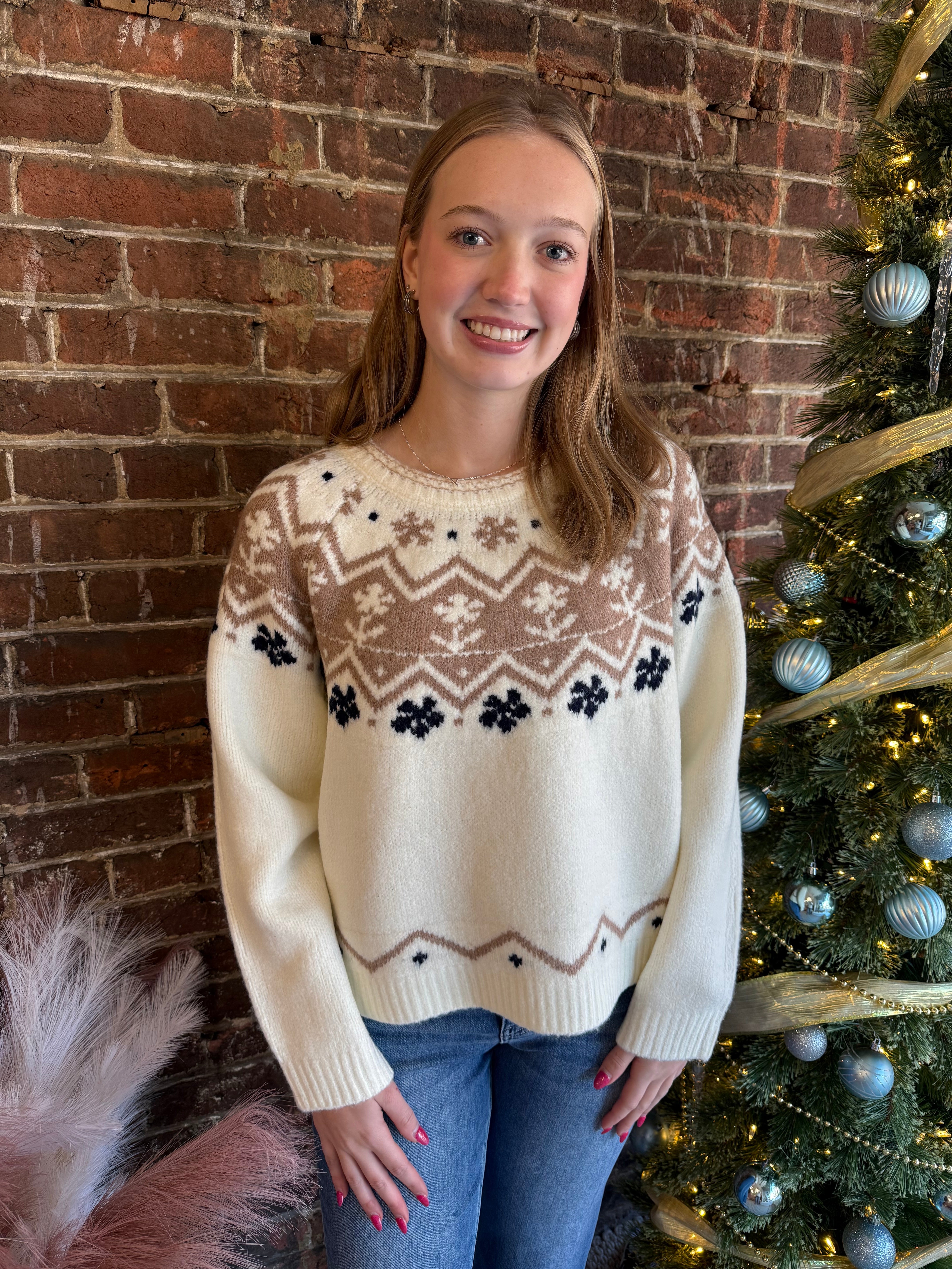 The Carol Sweater blends softness and style in a chic ivory knit accented with warm beige and black floral Fair Isle patterns. Its classic crew neckline, long sleeves, and relaxed fit make it ideal for layering on cooler days or standing out on its own. Experience comfort and timeless elegance effortlessly with this versatile wardrobe essential.