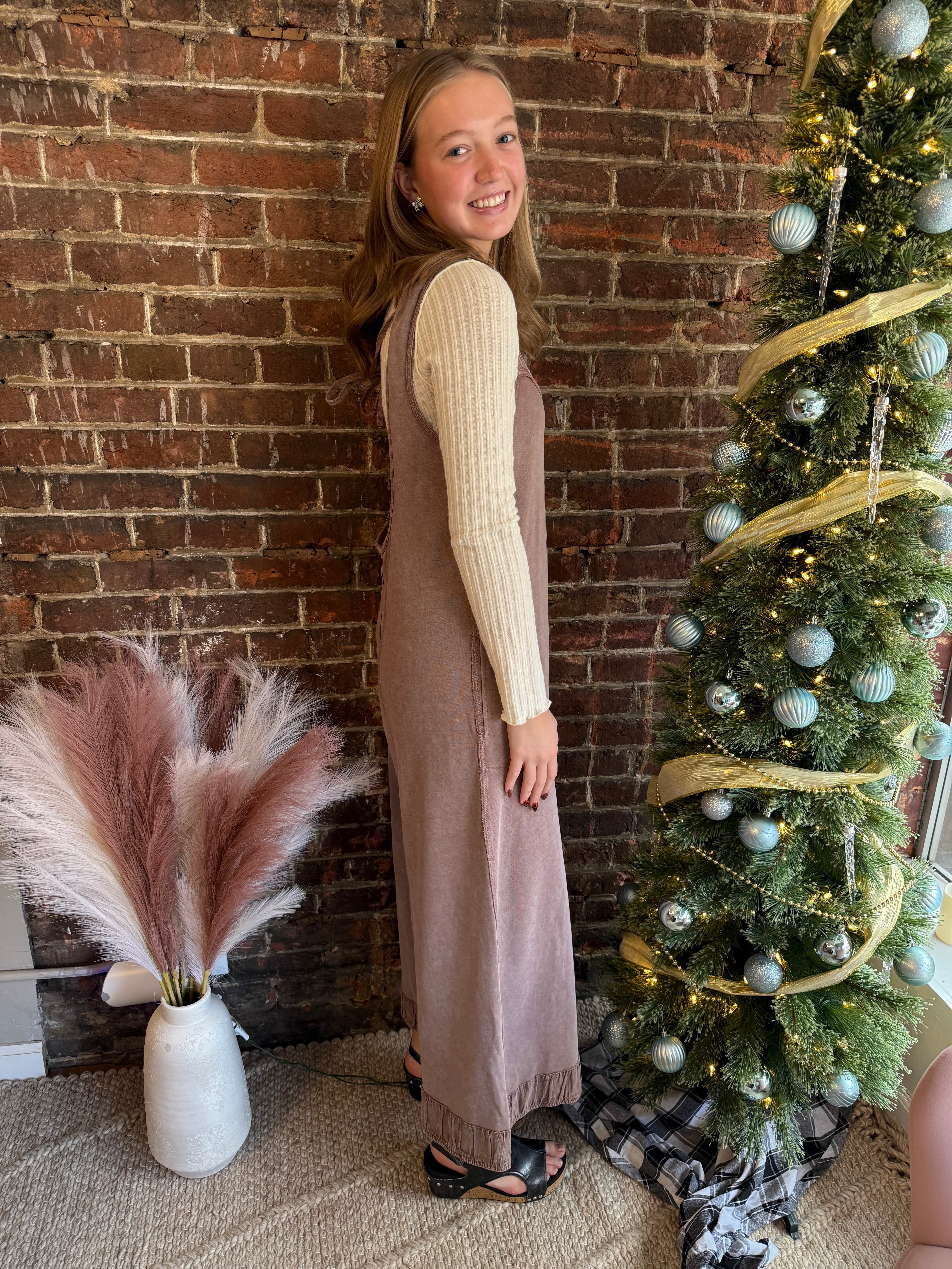 Step into the playful charm of the Jolie Jumpsuit in Red Bean. Crafted from soft cotton knit with a mineral wash, this sleeveless jumpsuit features stylish seam details and handy side patch pockets. Its open back with a cute tie detail adds a flirty touch, while gathered pleats at the ankle hem create a fun, wide-leg silhouette. Enjoy a relaxed fit perfect for effortless, all-day comfort with a hint of whimsy.