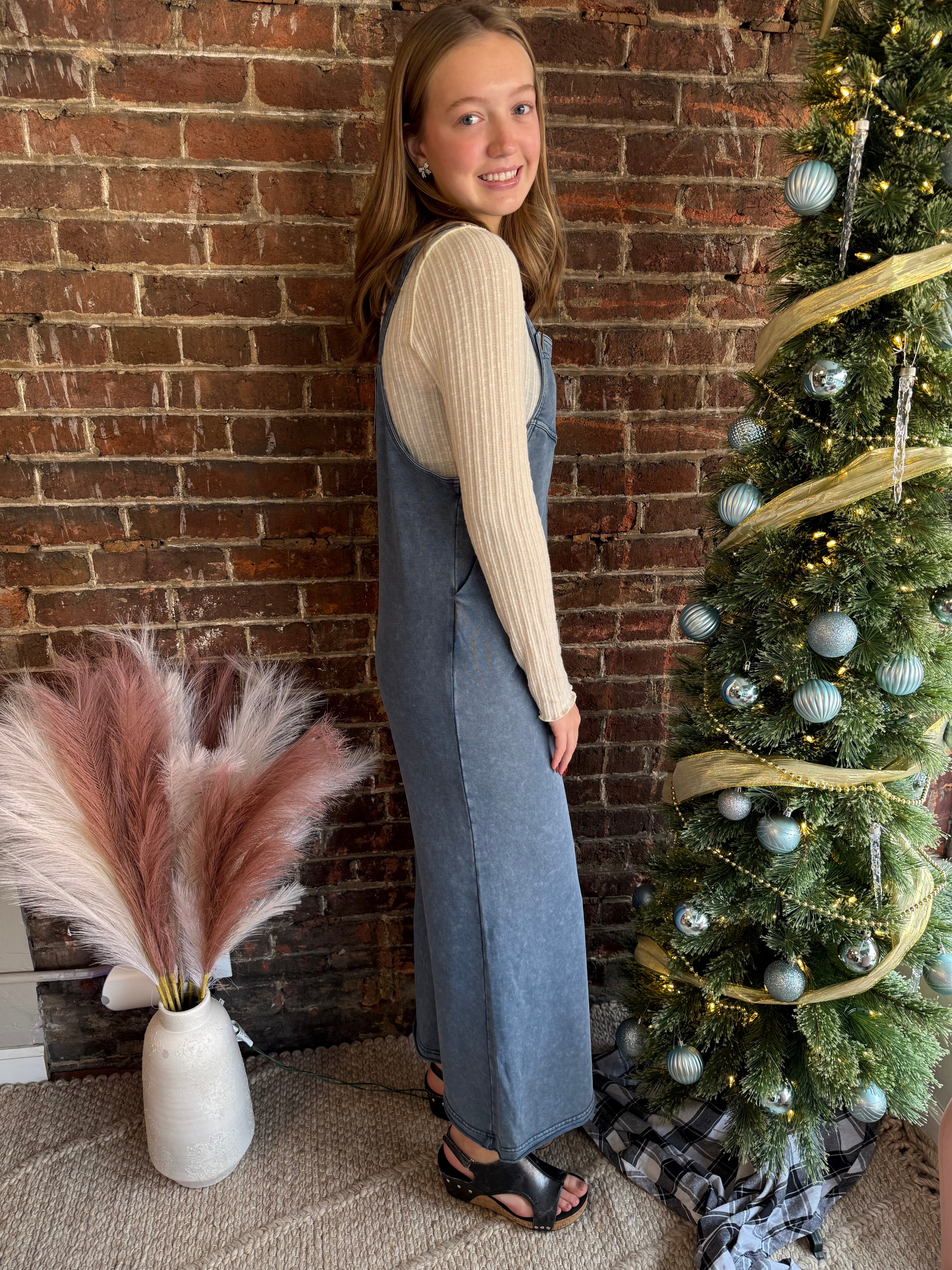 Get ready to jump into comfort with the Stacie Jumpsuit Overalls in indigo! Made from cozy cotton French terry with a cool mineral wash, this sleeveless wonder features adjustable button straps for the perfect fit. Side pockets keep your essentials handy, while wide legs and seam details give you all the relaxed, playful vibes you need for any day of fun. Stylish, comfy, and ready for adventure!