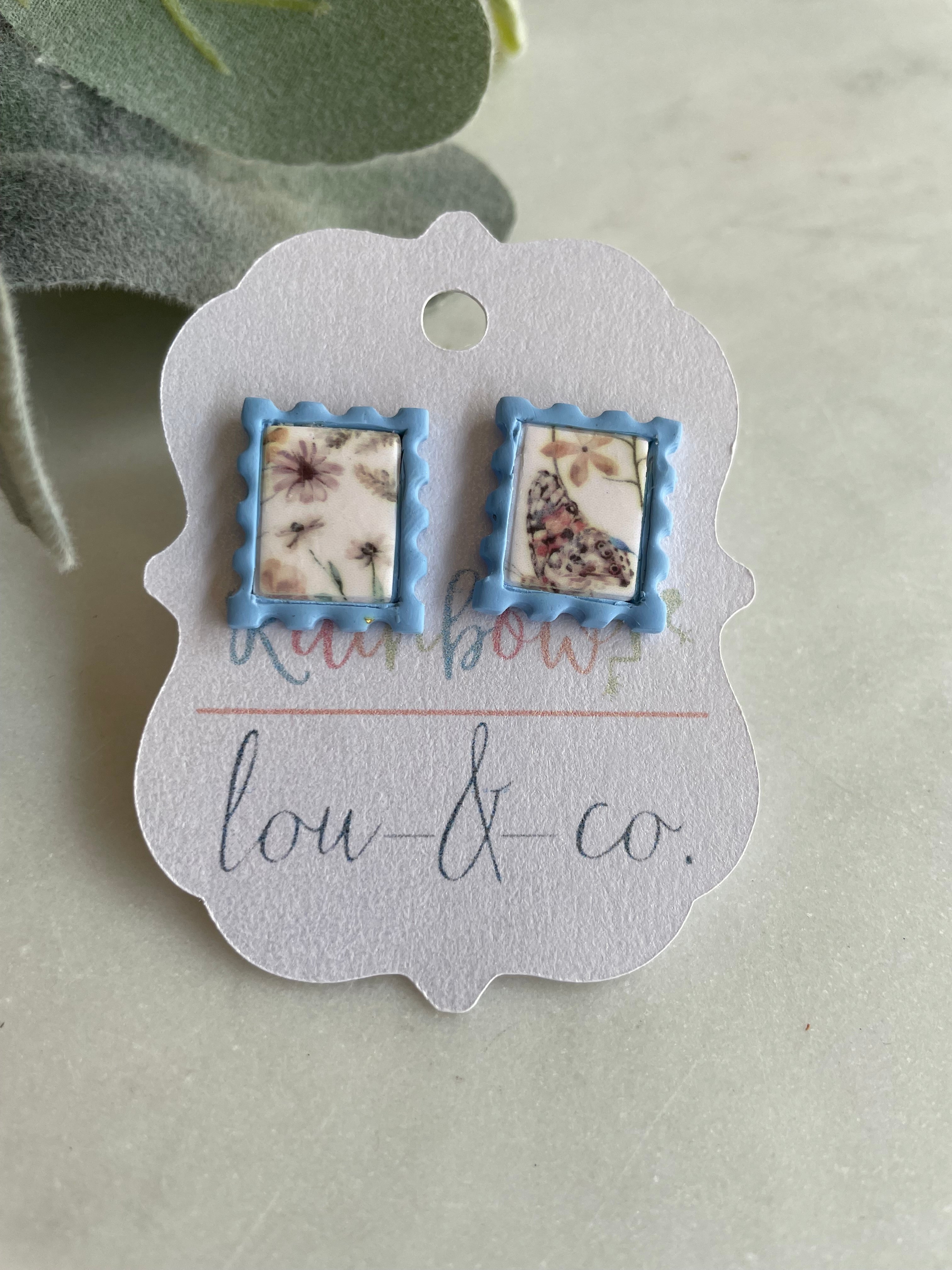 The cutest “stamp” earrings! One earring has a butterfly and the other has flowers.