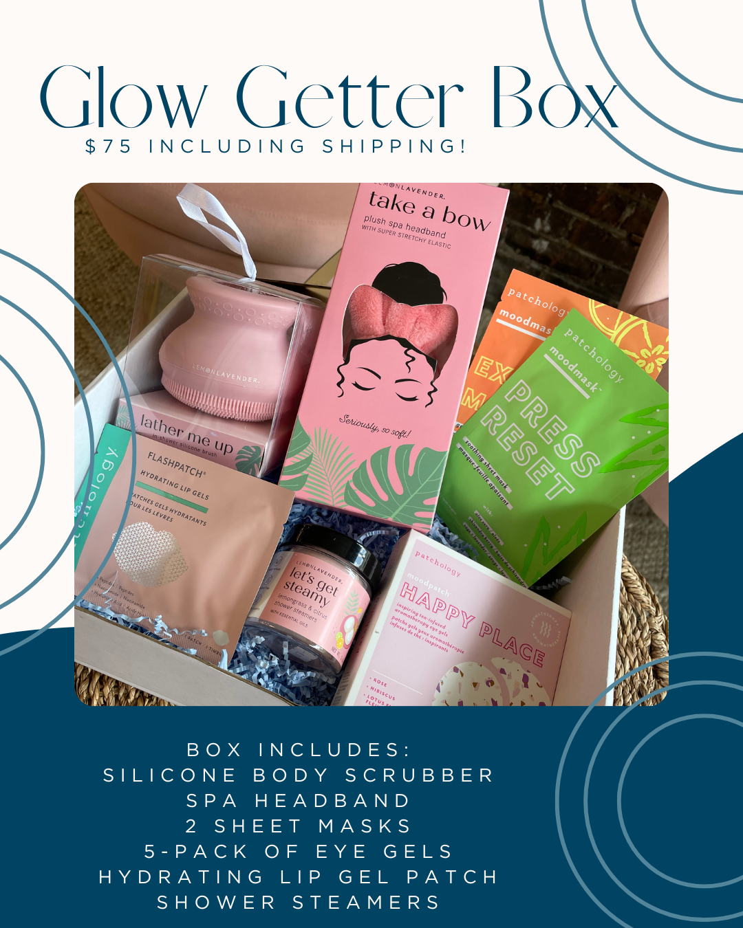 Unbox your glow with the Glow Getter Box! This playful set includes a silicone body scrubber for smooth skin, a spa headband to keep hair out of your face, two refreshing sheet masks, a 5-pack of soothing eye gels, a hydrating lip gel patch, and invigorating shower steamers. Perfect for turning any day into a mini spa escape that leaves you feeling radiant and refreshed.