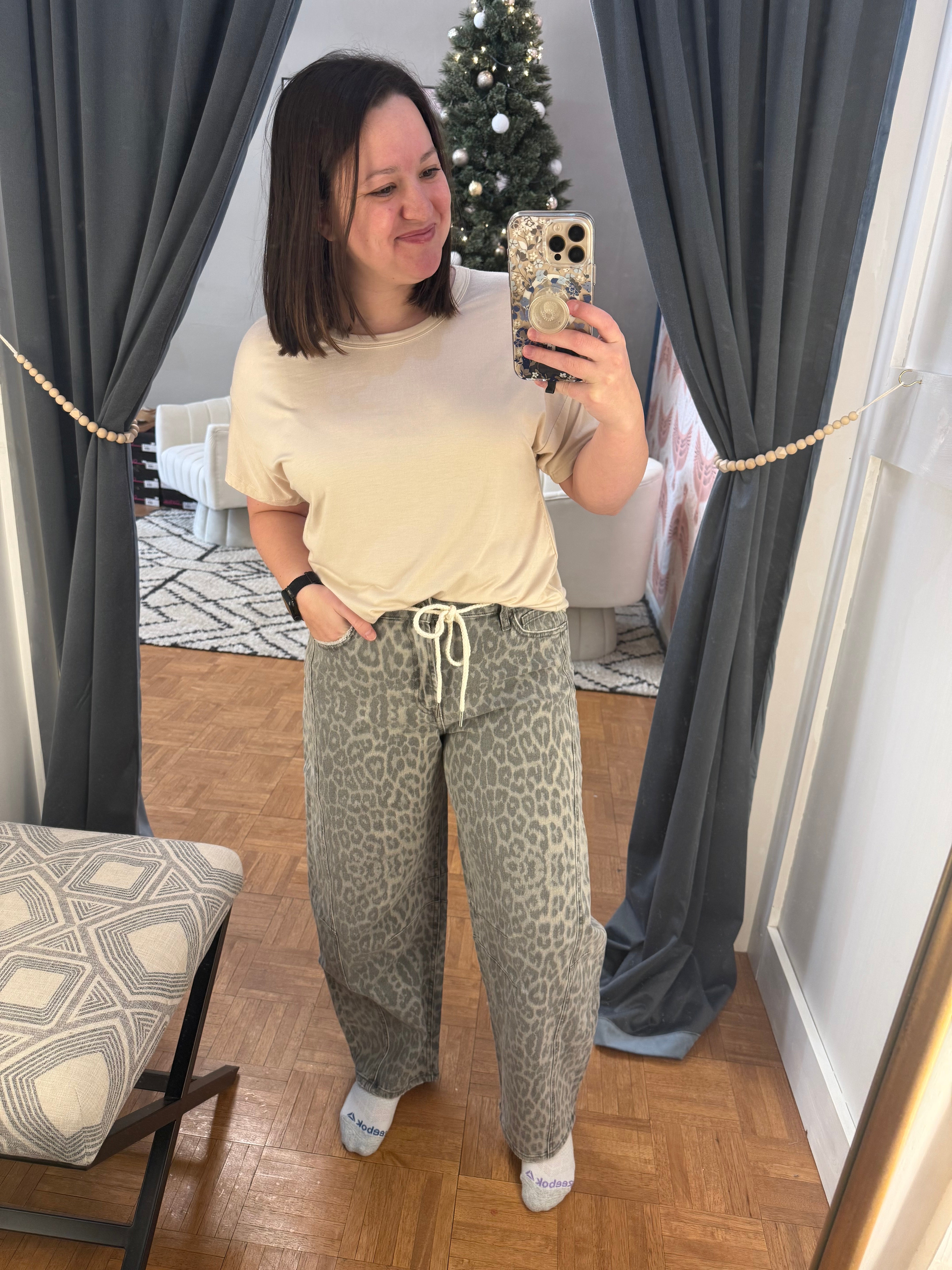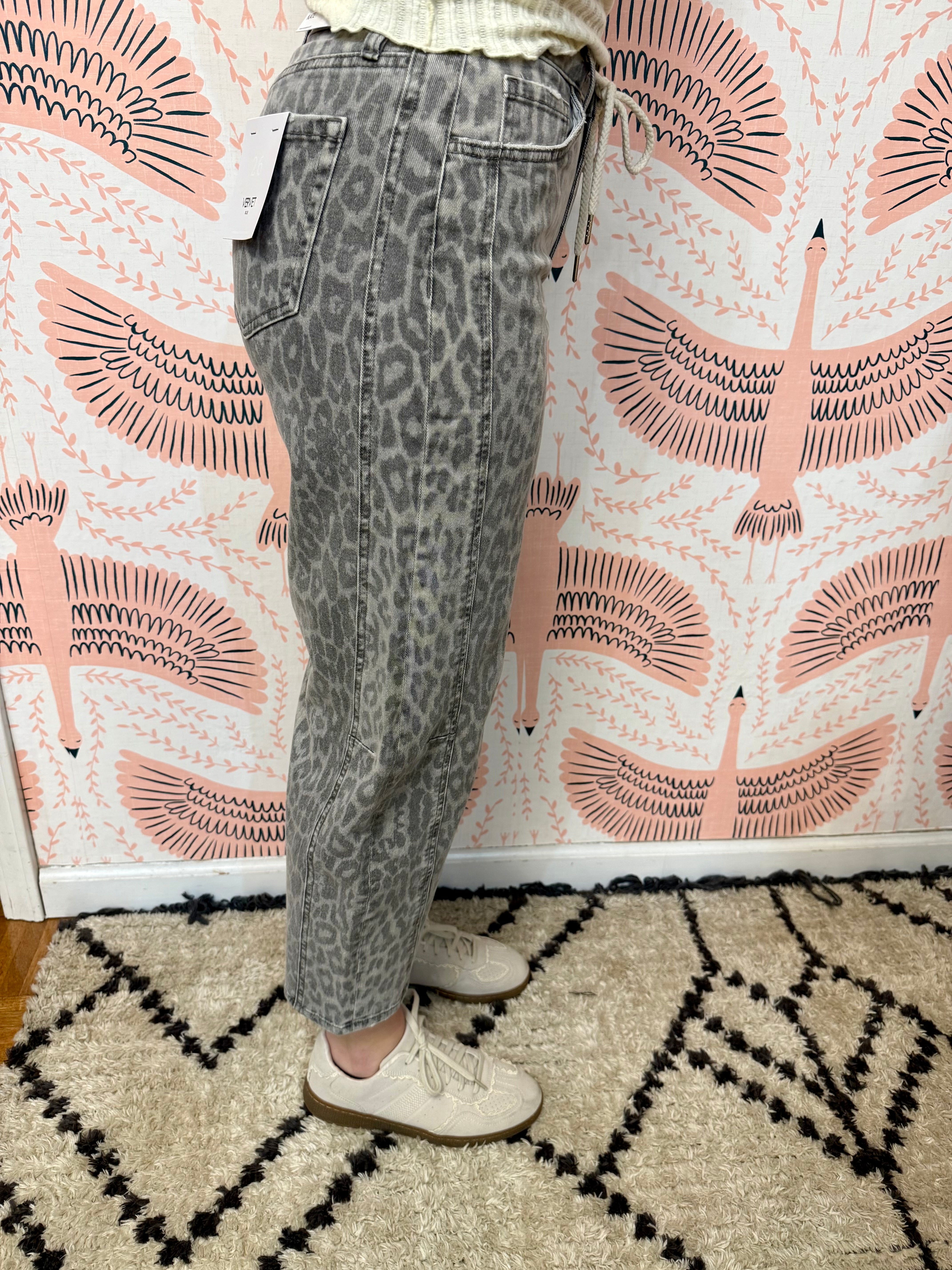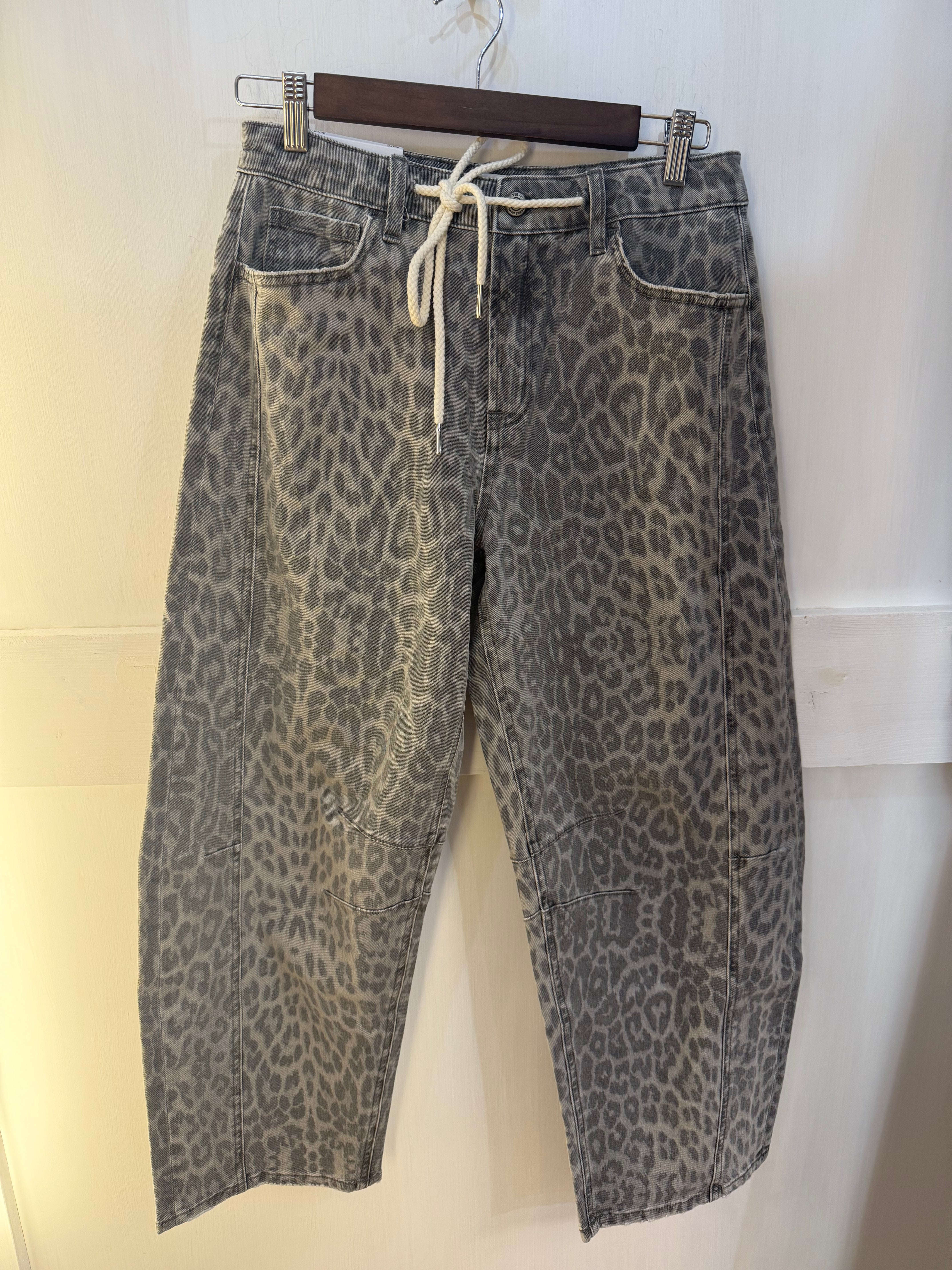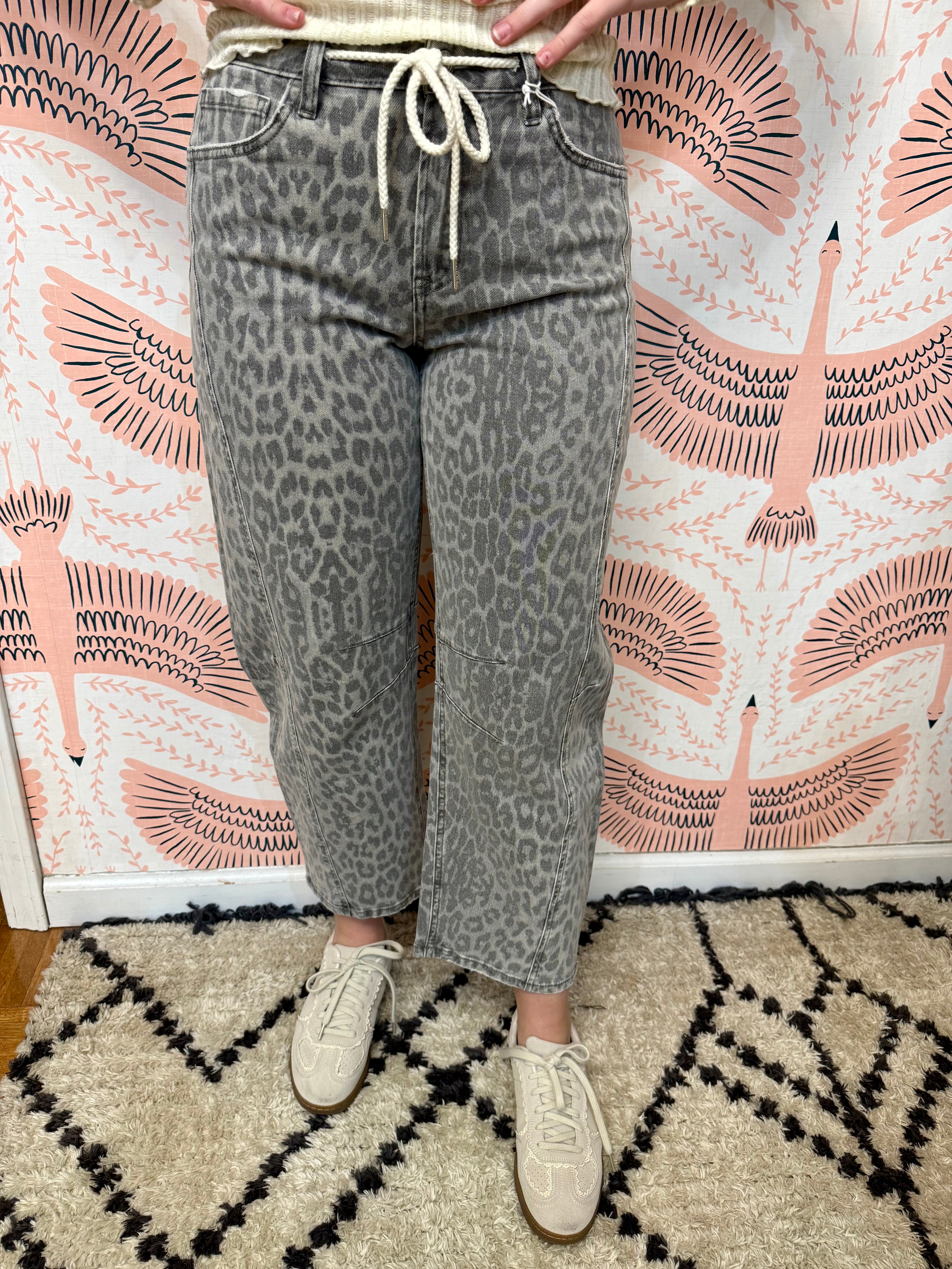 Step out in style with the Lindsey Leopard Barrel Jeans—where bold meets comfy. These eye-catching jeans feature a trendy leopard print, cropped length, and a flattering barrel cut that adds just the right amount of edge to any outfit. Perfect for turning heads while keeping your vibe effortlessly cool and playful.